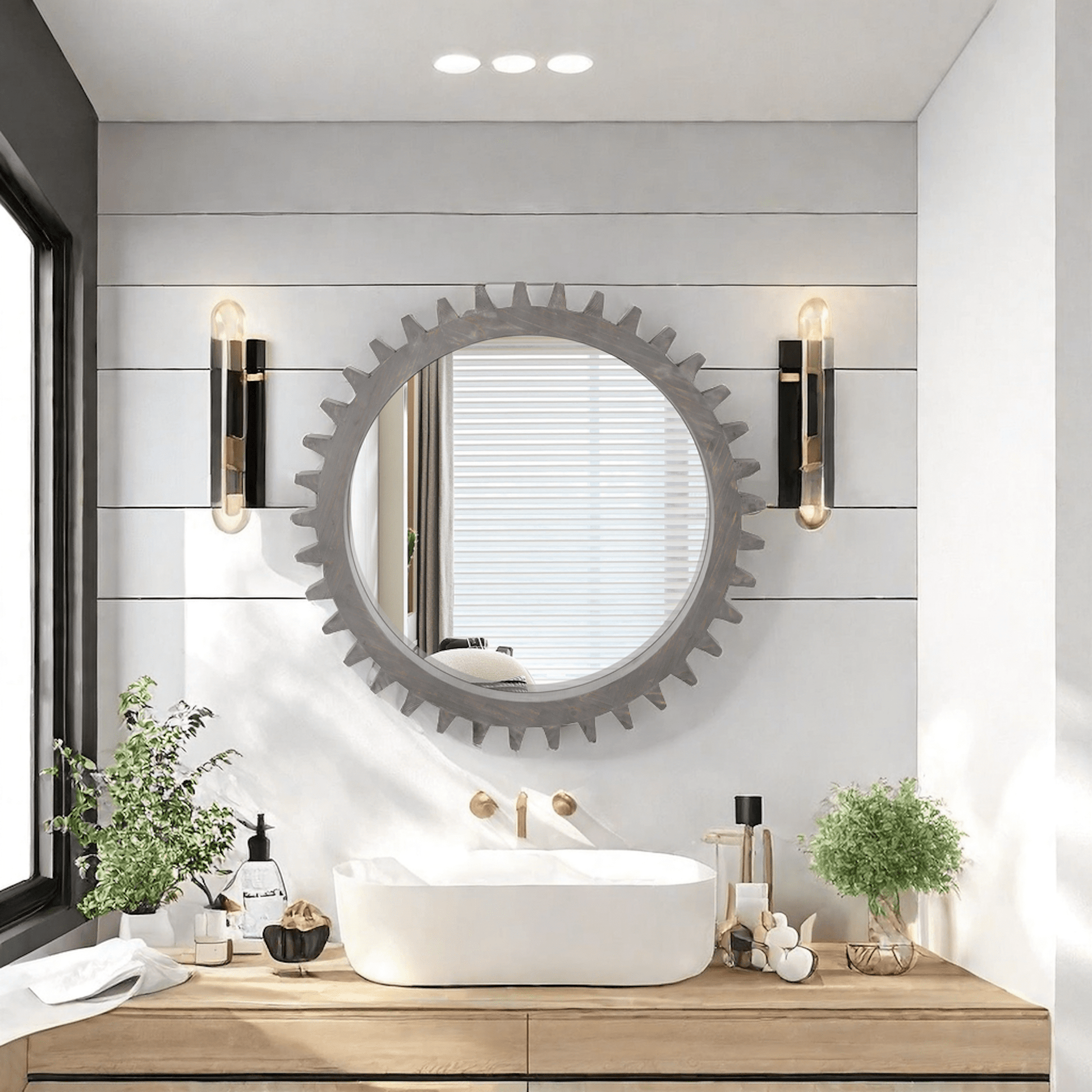 Firstly, the use of vintage gear mirrors in the bathroom can add a chic atmosphere to this intimate space. Choosing a suitable size for the bathroom and hanging the vintage gear mirror on the wall or placing it on the countertop can satisfy the function of daily use, but also inject a touch of nostalgia into the whole bathroom. Especially when paired with vintage style sinks and bathroom cabinets, vintage gear mirrors complement the entire space, creating a serene and elegant atmosphere.