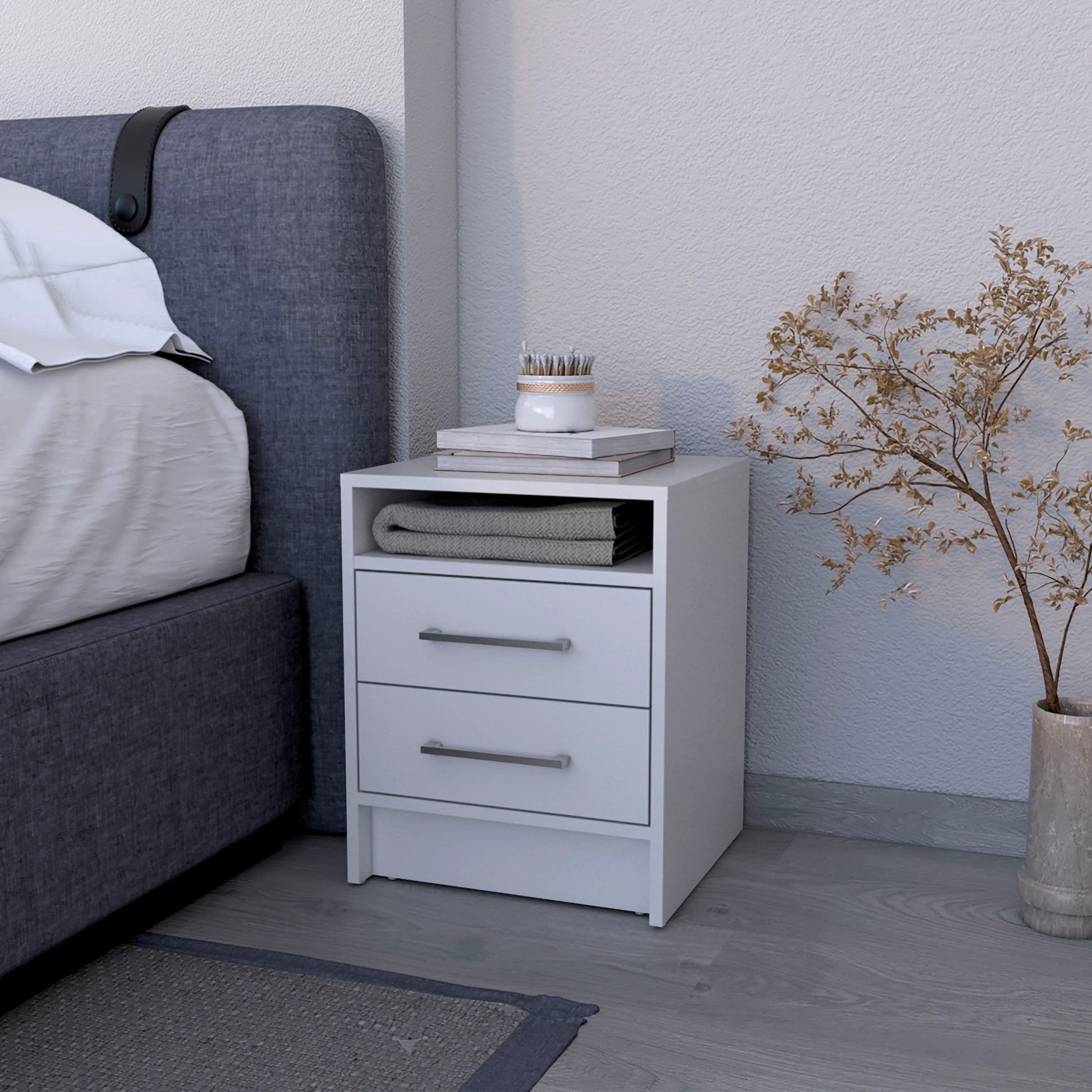Transform your bedroom with this stylish nightstand, featuring two spacious drawers on high-quality rails for smooth operation and an open shelf for additional storage. Crafted from durable melamine and particle board, it offers a practical and elegant solution for all your storage needs, making it perfect for any decor.
