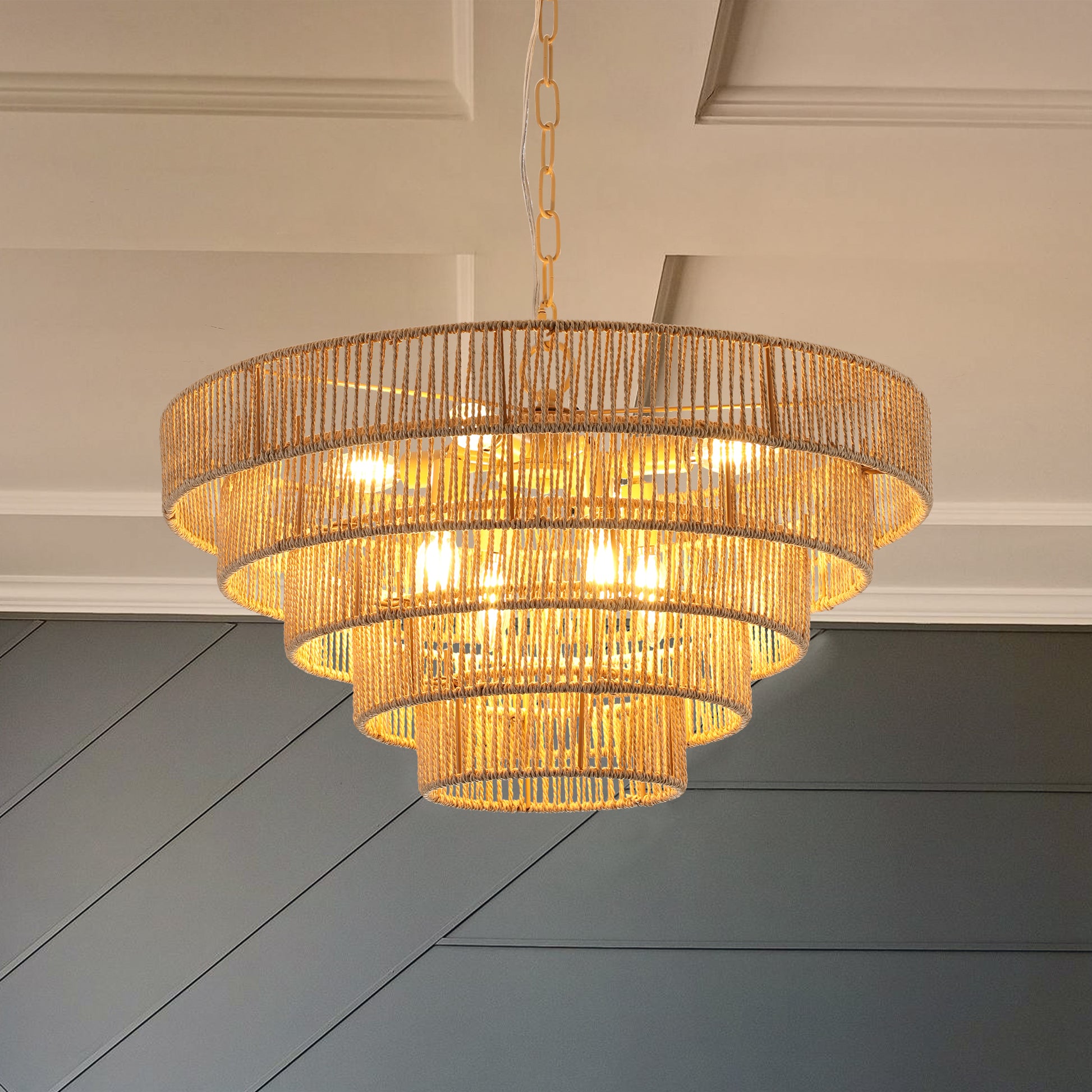 (Same as W1340P155977/L1019-5) 24' Modern 5-Layer Woven Hemp Rope Chandelier, Boho Style Pendant Light, Elegant Hanging Light Fixture for Living Room, Dining Room, Bedroom (No Bulbs)