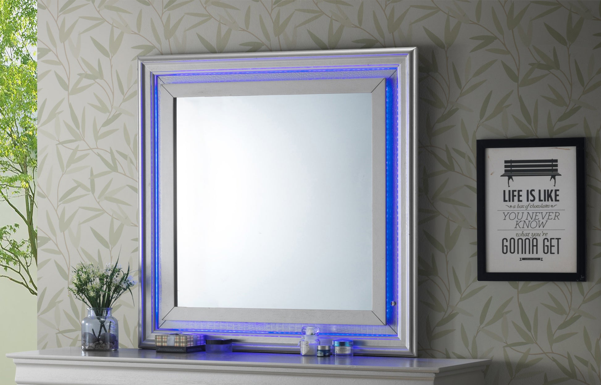 Transform your bedroom with this captivating mirror that brings a contemporary flair to your space. The striking silver champagne finish not only elevates the design but also brightens the entire room, offering a warm and inviting atmosphere. Enhanced with LED accent lighting on the headboard, this mirror proves to be a stylish and functional piece, especially in dimly lit environments.