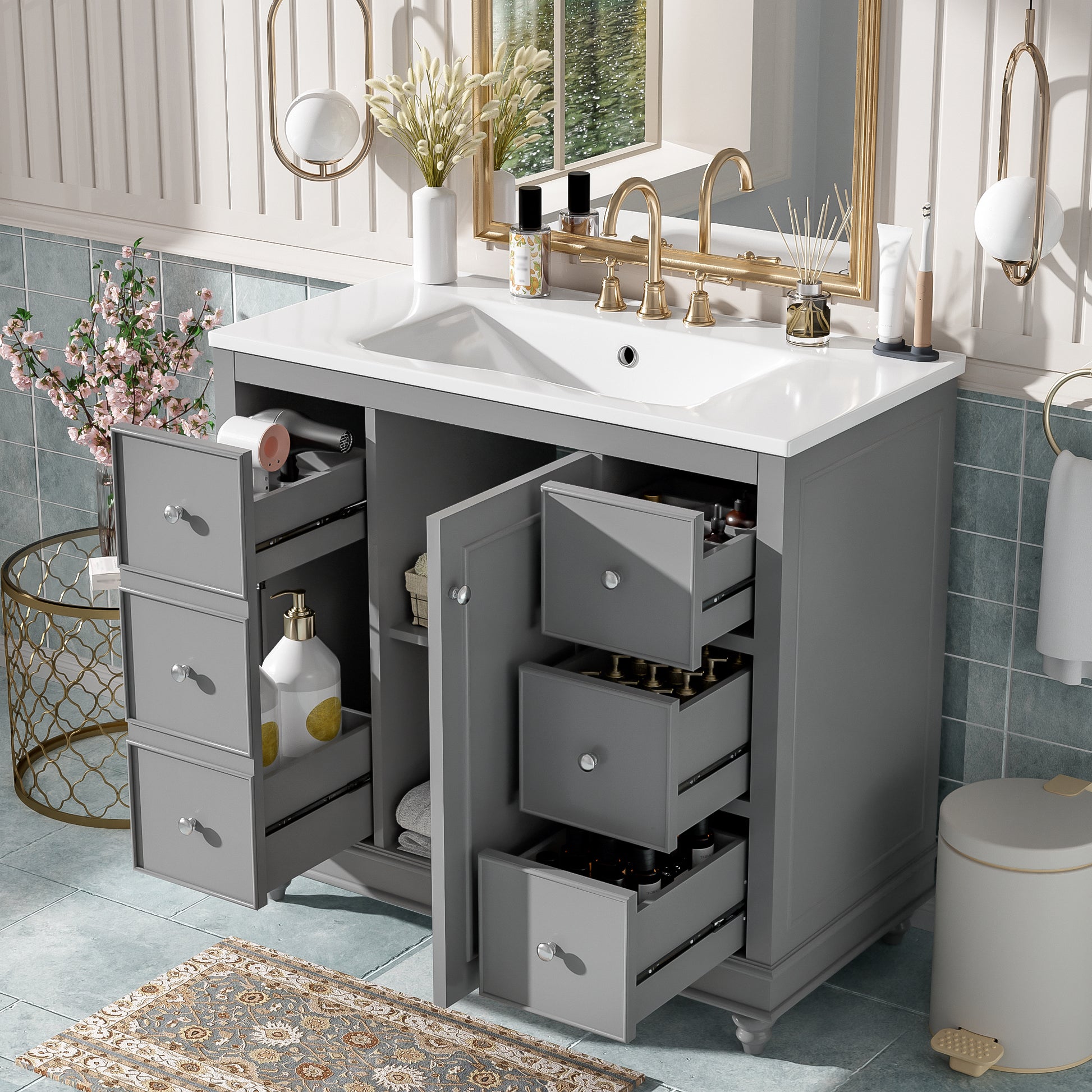 Give your bathroom the refresh it deserves with this 36-inch modern vanity. Designed for functionality and elegance, it features a durable ceramic sink, soft-close door with a U-shaped adjustable shelf, one divided drawer, two shallow drawers, and one deep drawer — everything organized with ease. Crafted from solid wood and MDF, it combines stability, storage, and sleek design for daily comfort and long-lasting beauty.