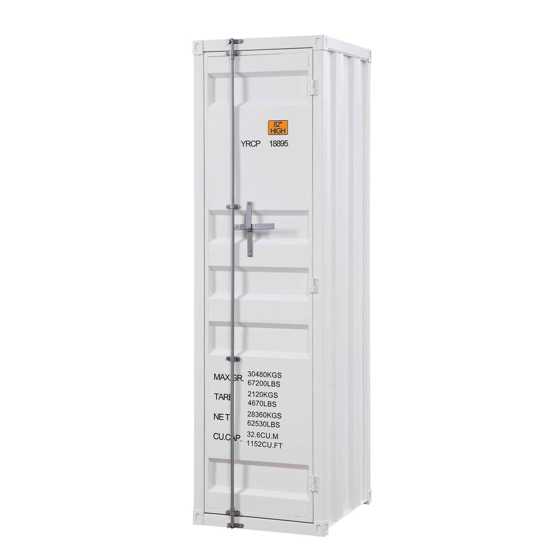 This industrial-style wardrobe features a sturdy metal frame with recessed panels reminiscent of cargo containers, providing a sleek and modern touch to any space. Equipped with a metal interior shelf for folded items and a hanging clothes rod for organized garment storage, it offers both functionality and style while ensuring the security of your belongings with a full-length container lock.