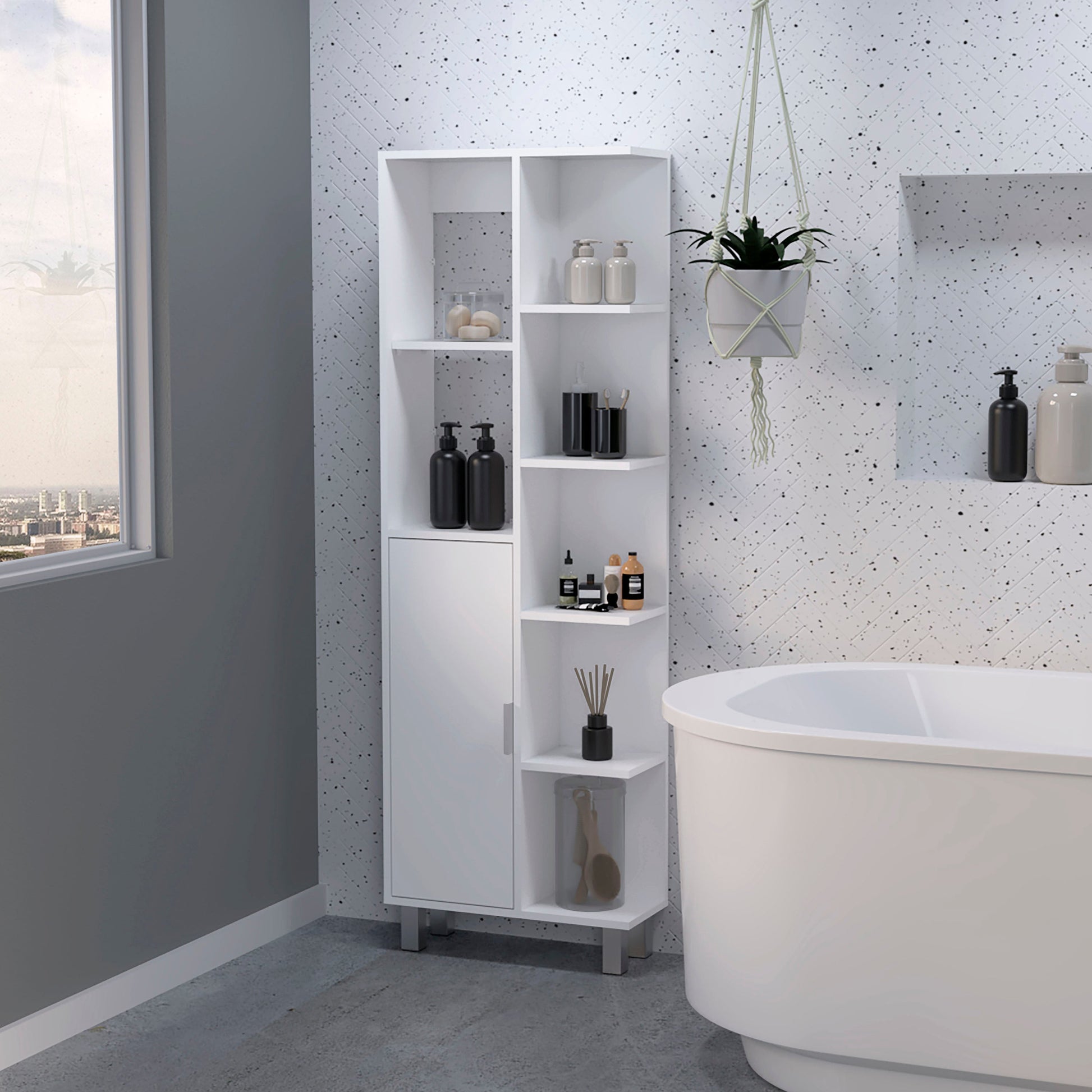 Elevate both organization and style in your bathroom with our elegant cabinet, boasting a door that opens to reveal ample storage space. Featuring four generously spacious top shelves and five lower shelves, this cabinet offers optimal organization for towels, linens, and toiletries, all wrapped in a beautiful white finish that complements any bathroom decor.