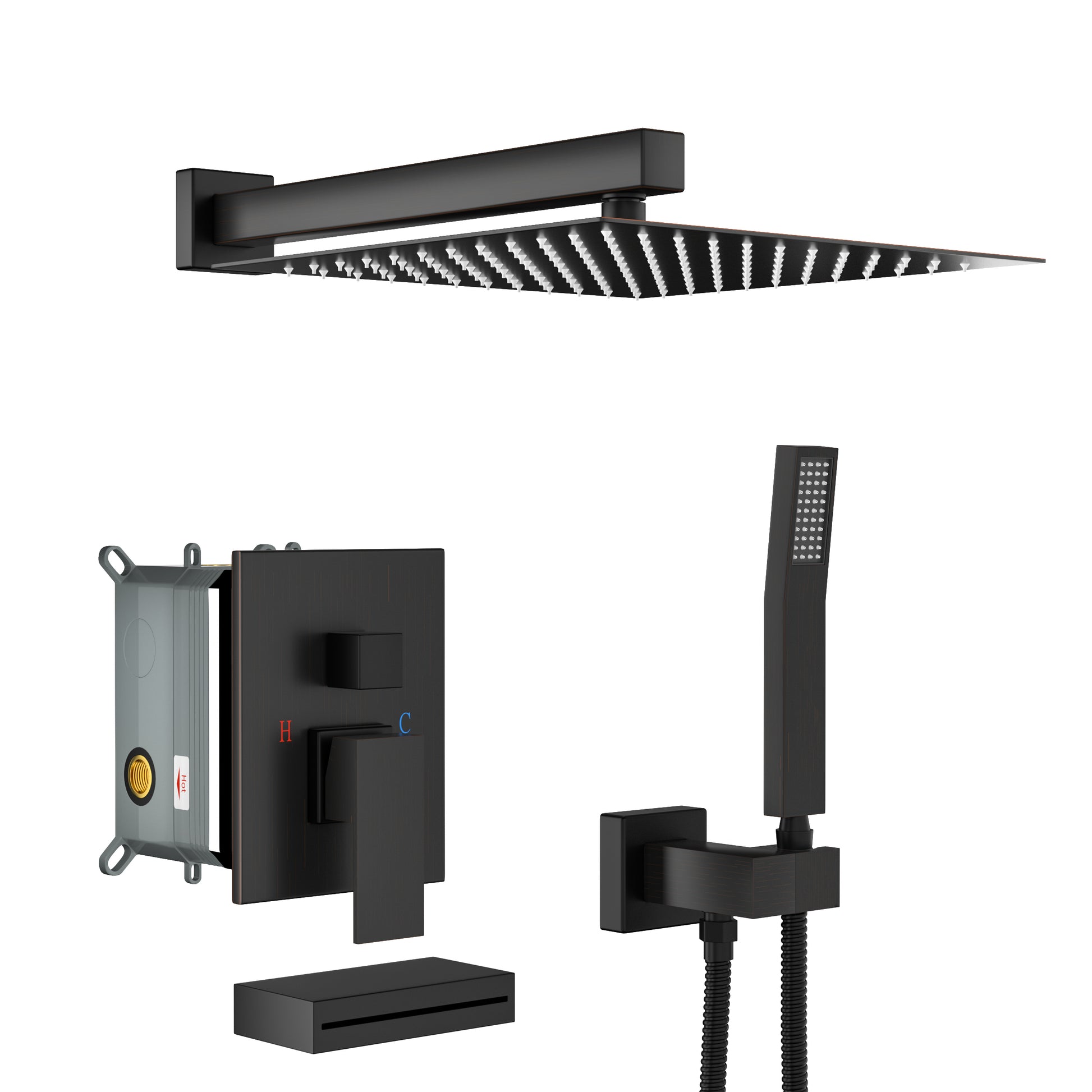 Oil-Rubbed Bronze 12 Inch Wall Mounted Square Shower System with Waterfall Tub Spout and Rough-in Valve