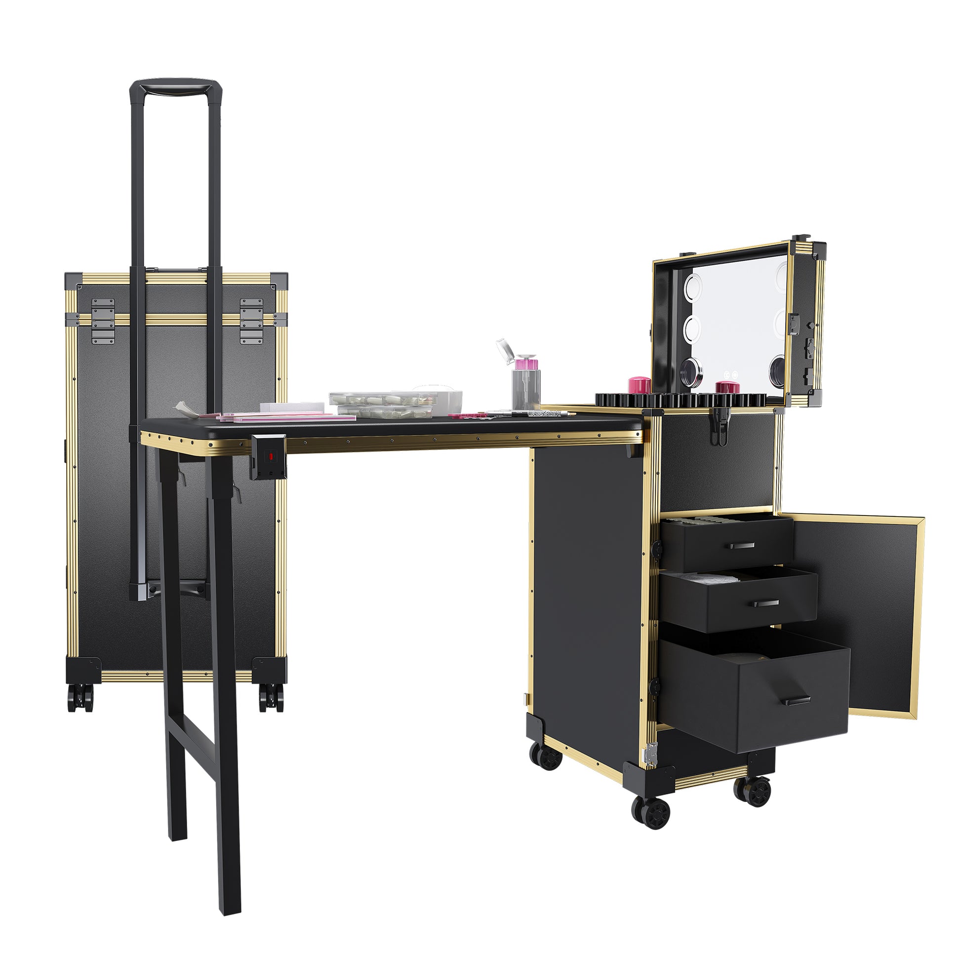 Portable Nail Art Table with LED Mirror, Bluetooth, Lockable Drawers, Telescopic Pole - Black Gold, Plastic, 15.35x12.60x27.56 inches