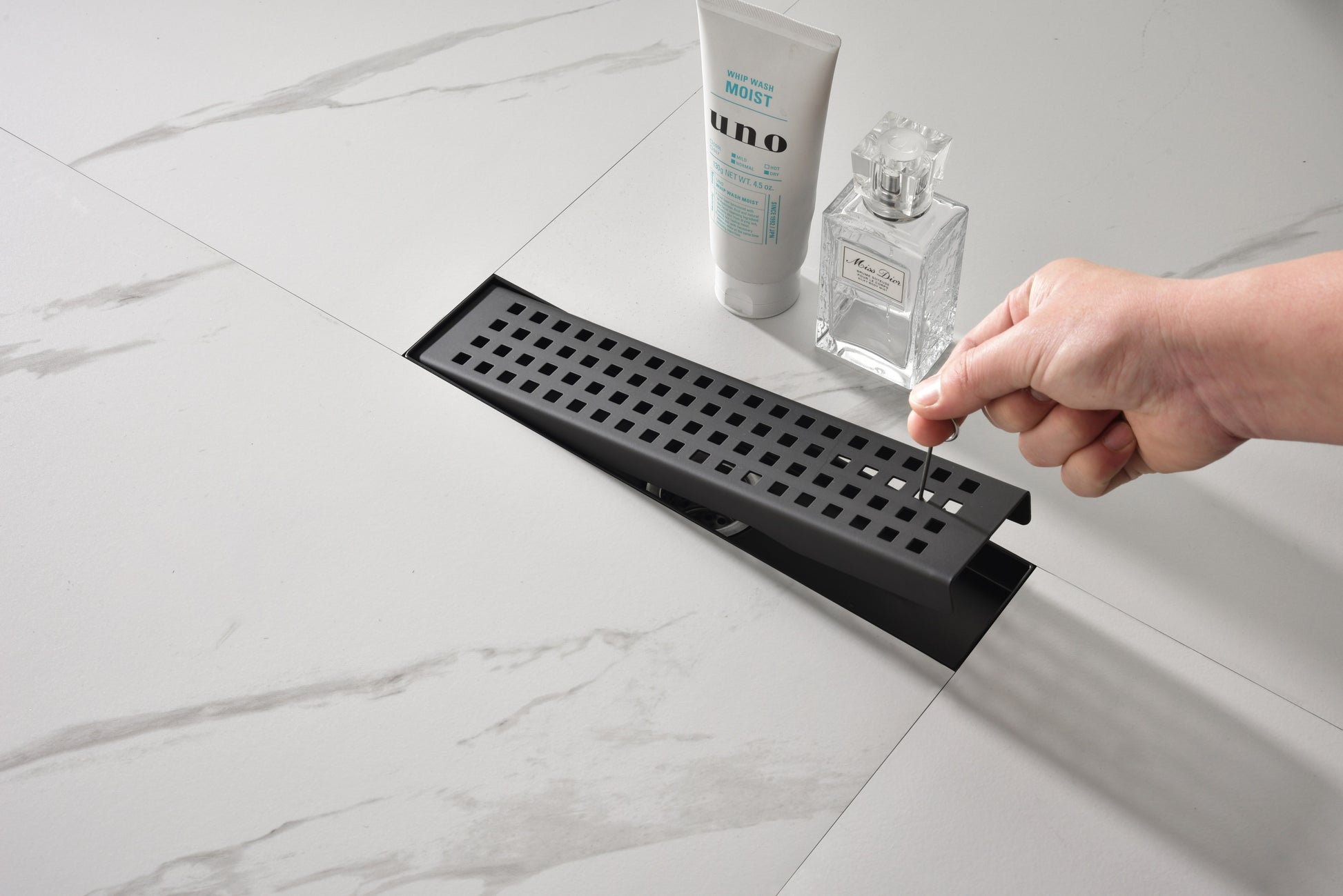 - The linear shower drain features a stylish brick pattern cover design that enhances water flow and ensures water drains quickly and efficiently.