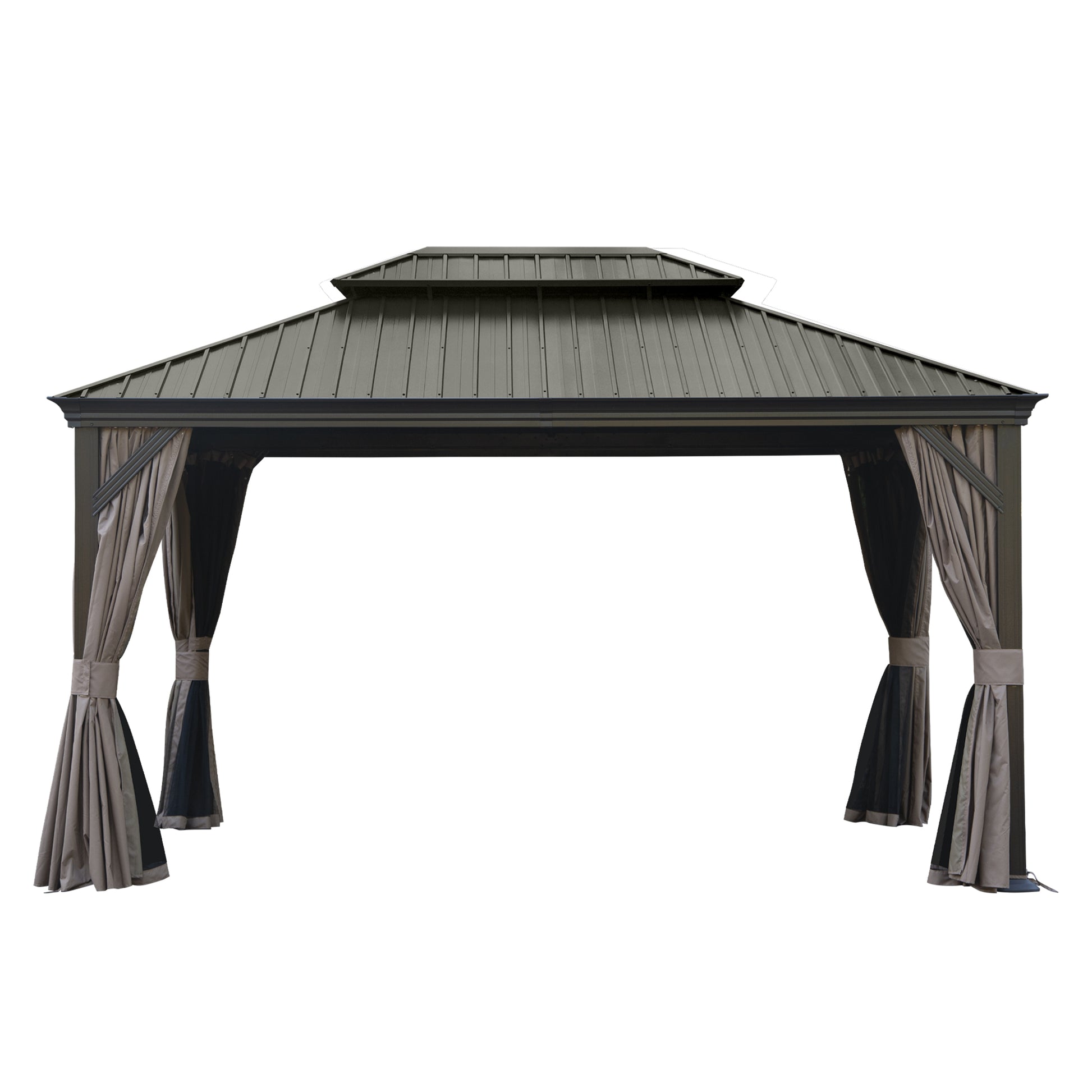 10' X 14' Hardtop Gazebo, Upgraded Metal Gazebo with Drainage System, Dual-Layer Galvanized Steel Roof, Curtain and Netting, Outdoor Shelter Canopy for Patio, Garden, and Backyard, Brown