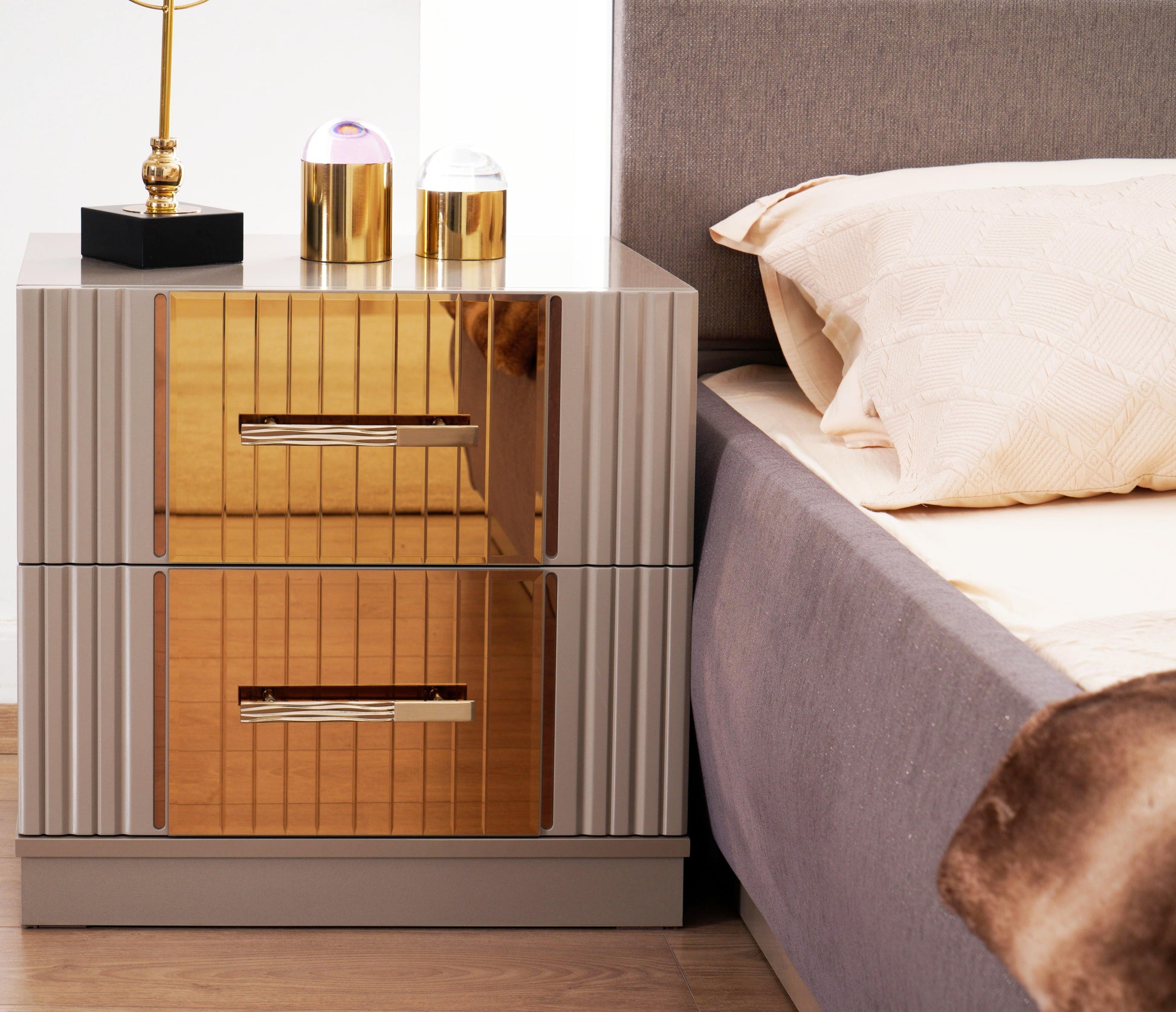 The nightstand in this bedroom set is a fusion of elegance and functionality. Its sleek design, adorned with bronze mirror accents, mirrors the set's luxurious theme. The nightstand provides convenient bedside storage, with straight lines and slender shapes that emphasize its contemporary appeal. It's an essential piece that combines practicality with the modern luxury of the set.