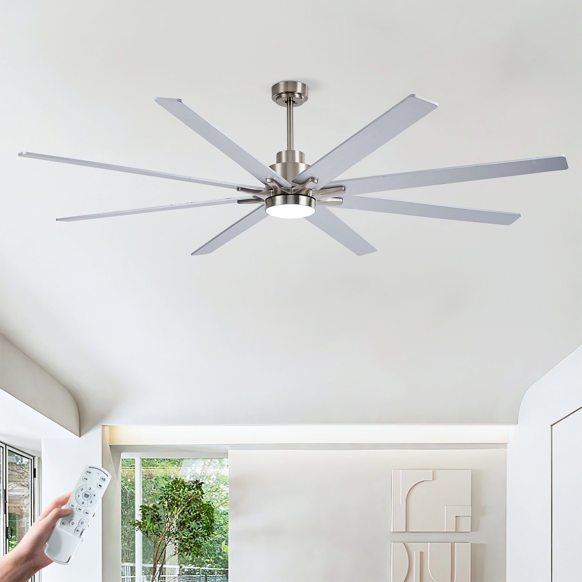 8 PCS Plywood Reversible Blades Ceiling Fan With Light Kit 3 Color Dimmable LED, DC 6 Speed ,Remote Control Ceiling Fan 84INCH (Sliver + Nickel )