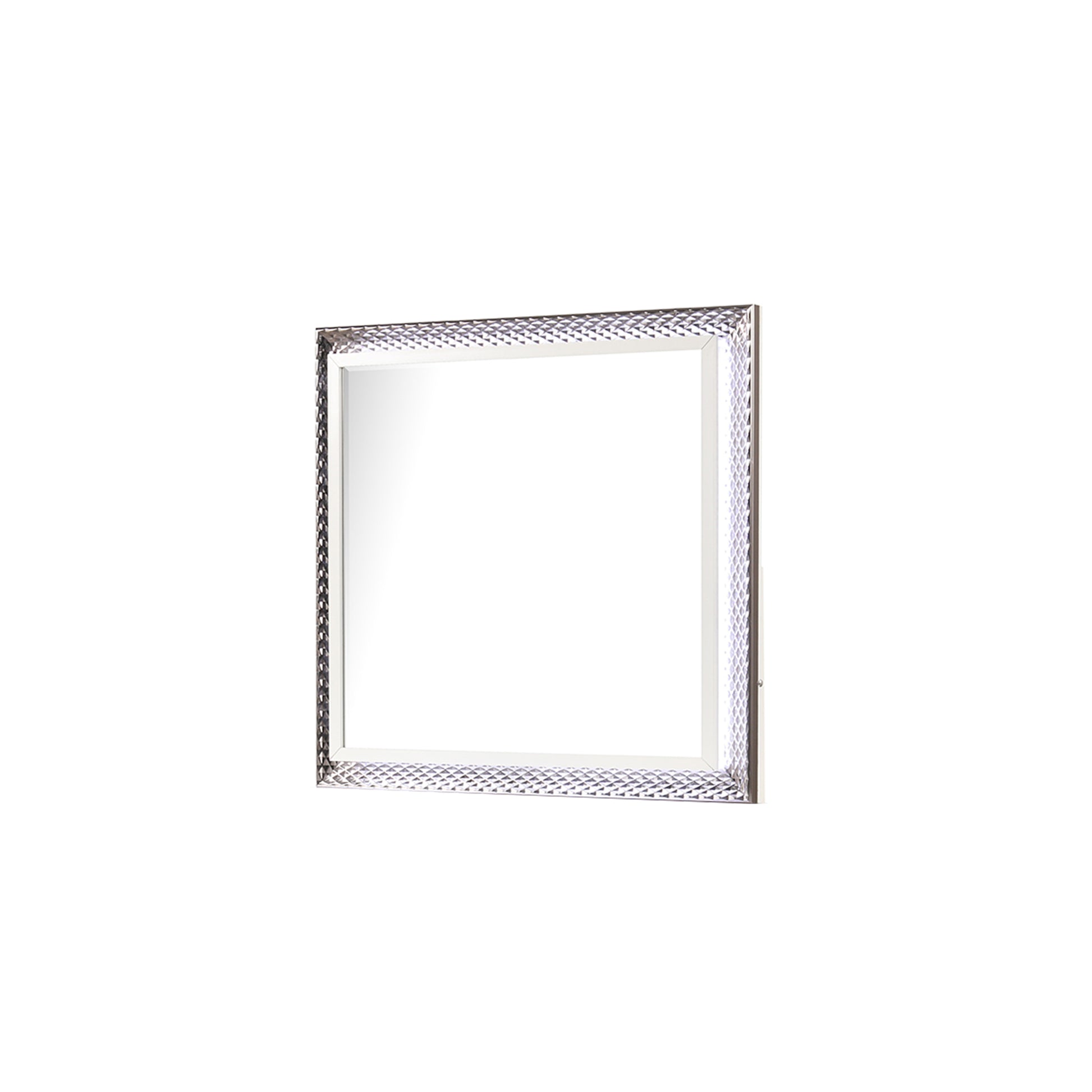 This modern mirror features a sleek square shape and elegant detailing, making it a stylish addition to any bedroom or living space. Its frame is adorned with an intricate diamond-patterned design that adds texture and sophistication, while integrated LED lighting along the border casts a soft, ambient glow, highlighting the frame’s details and creating a warm, inviting atmosphere. Designed for both functionality and durability, this mirror provides a clear reflection for everyday use and complements a wide range of interior décors.