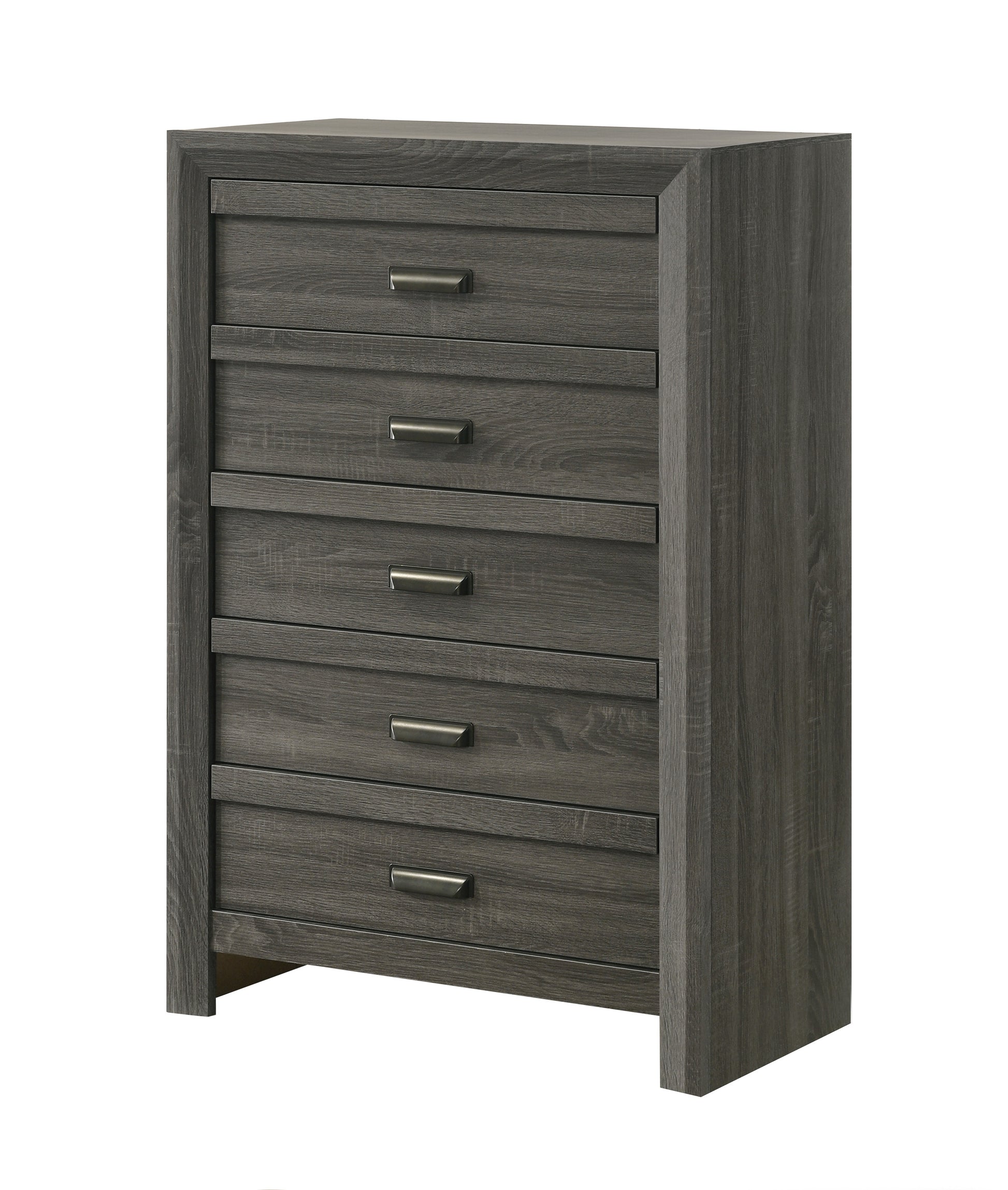 This Chest combines style and utility. It comes in a gray rustic finish and features five drawers with metal hand pull. This piece has an elegant look that will enhance any bedroom space.