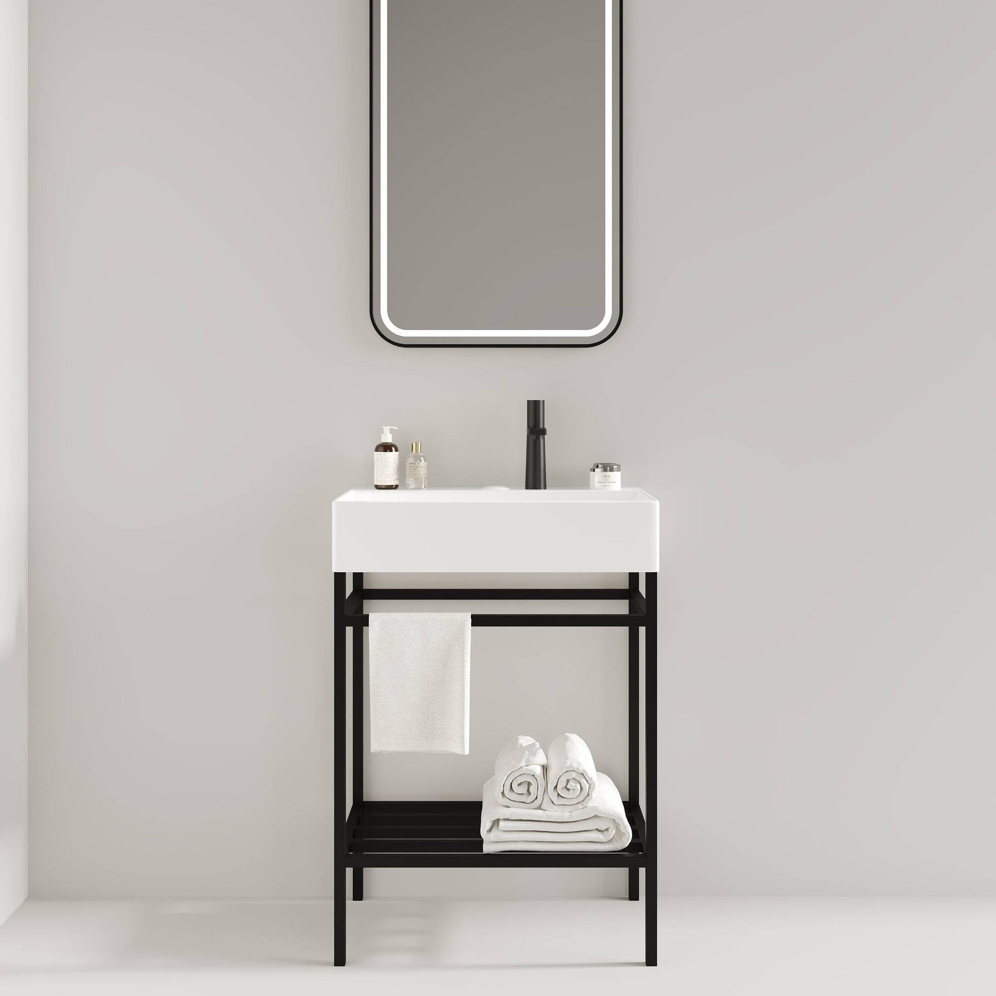 LOFI 24' Bathroom Vanity with Ceramic Basin, Freestanding Bathroom Console Sink Set, Glossy White Rectangular Ceramic Basin without Faucet, Open Metal Leg, Storage Shelves, Black Color