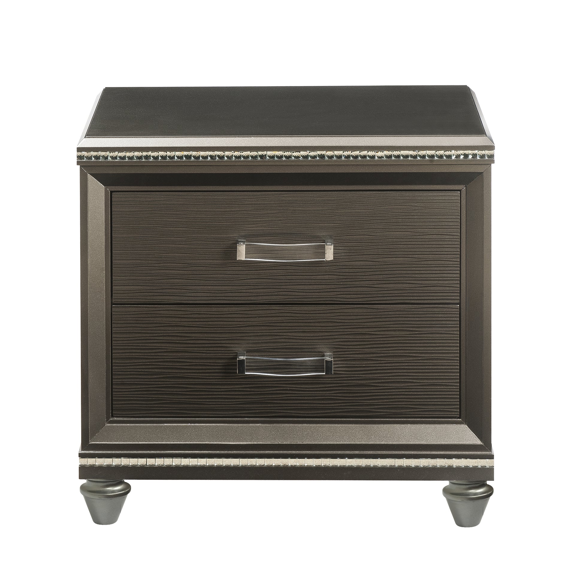 This nightstand features two drawers for ample storage and organization, with drawer construction including sparkling trim and embossed fronts for a luxurious look. The side metal glide drawer ensures smooth and quiet operation with 2/3 extension, providing easy access to stored items.
