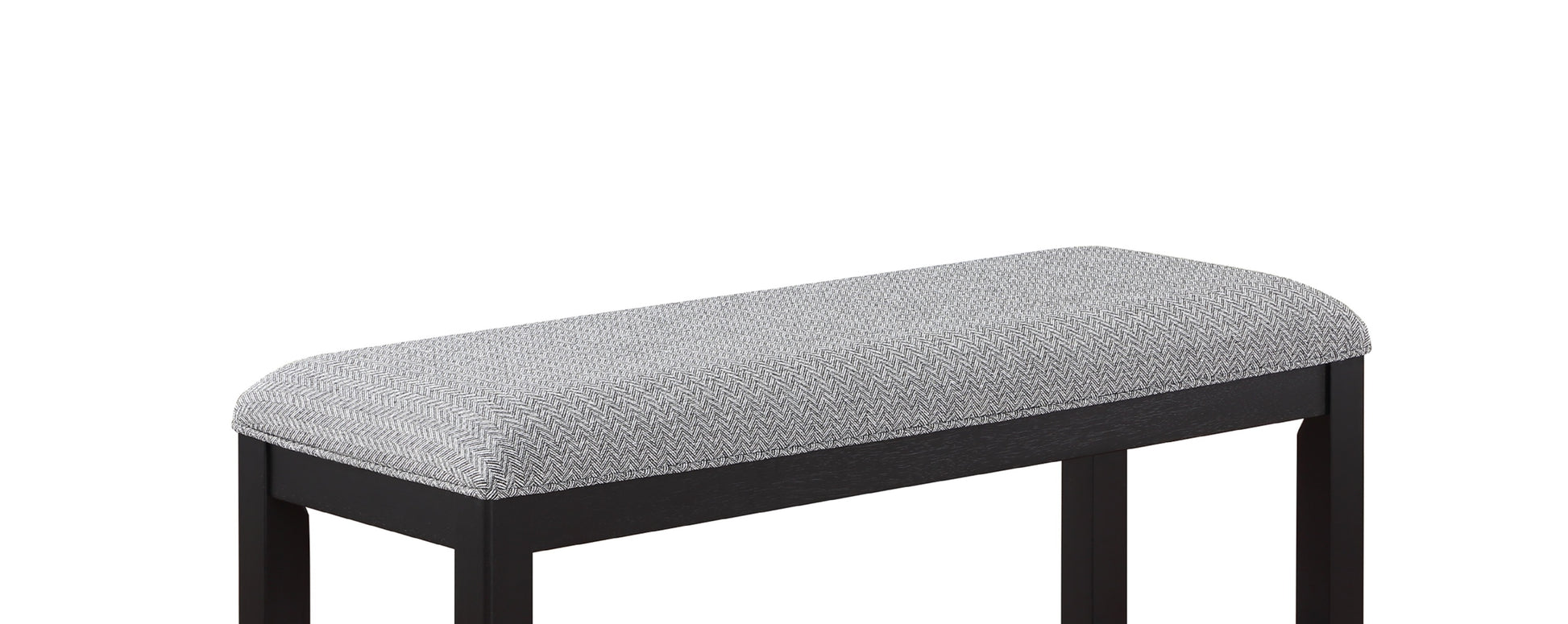 This counter-height dining bench is upholstered in a grey fabric and finished in a sleek black color. This bench is designed to be used at a counter-height table, providing comfortable seating while still allowing plenty of leg room. This gorgeous bench features a sturdy frame and is designed to be durable and long-lasting. This bench is perfect for any kitchen or dining space, adding both function and style.