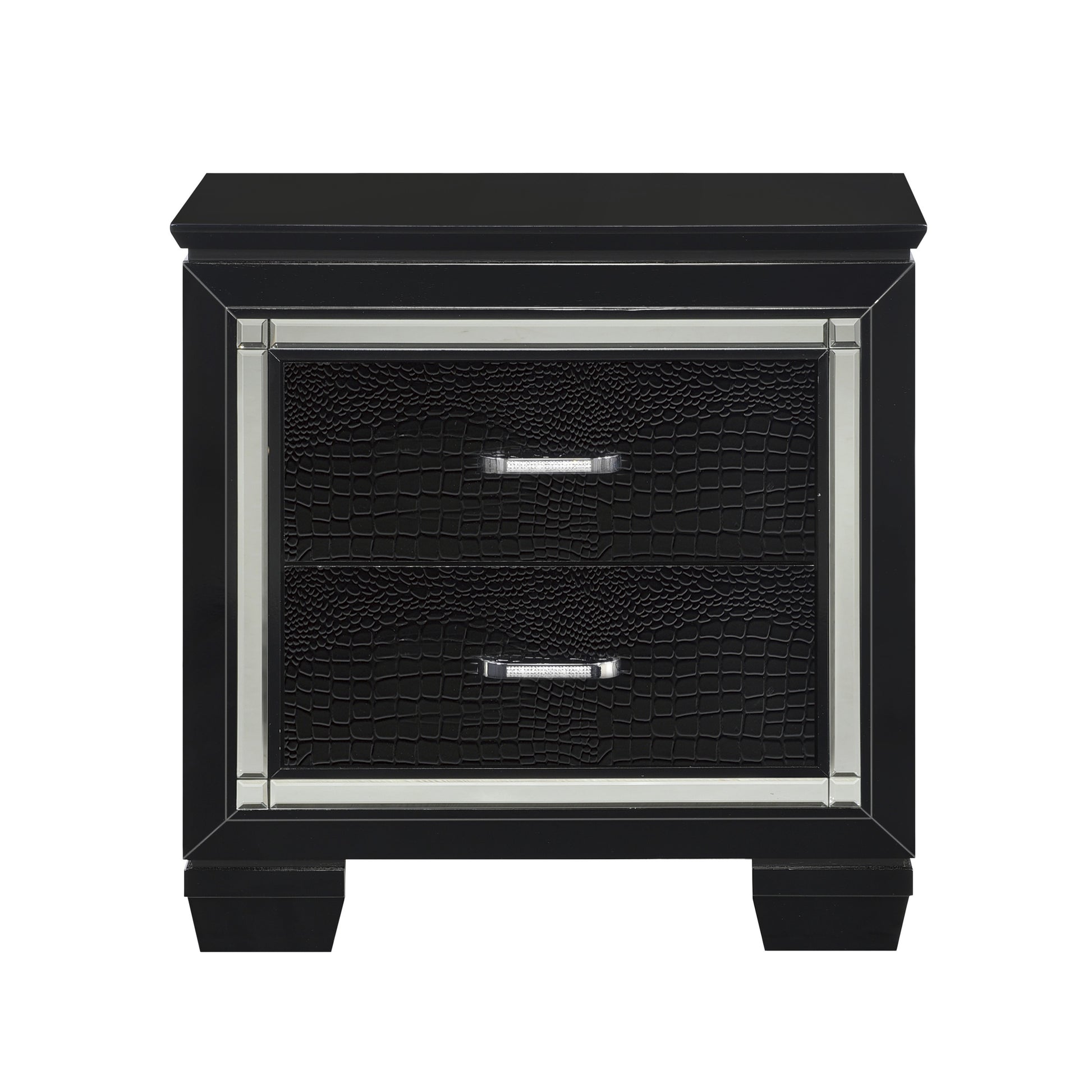 Glamour reigns in the design of this Collection. Framing the nightstand is a decorative beveled mirror accent that enhances the the under-light of the night stand. Alligator embossing and high polished crystal-enhanced hardware boldly accent the black finish.