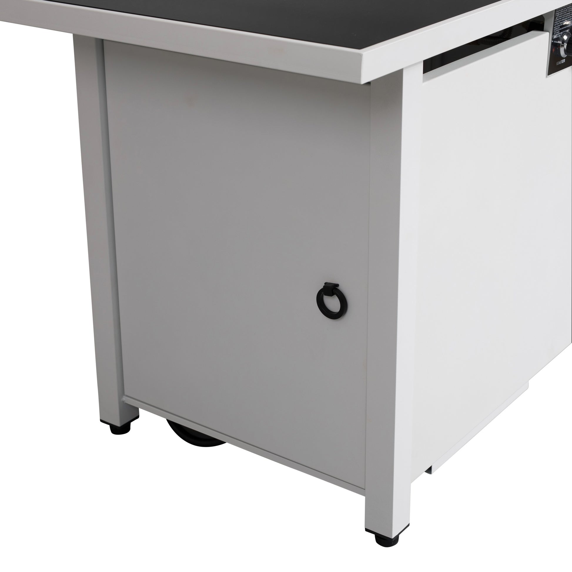 Turn any chilly evening into a cozy gathering with this modern fire pit table. Crafted with a steel base, this table features a neutral finish that resists rust and weather, so it's ready for use on your patio or deck. We love the stainless steel top and included lava rocks that add a contemporary look, while a side door opens for easy access to your propane tank or natural gas (sold separately) and a control panel that has integrated ignition. This fire pit table comes with a protective cover, and it's safe for use on a wood deck.