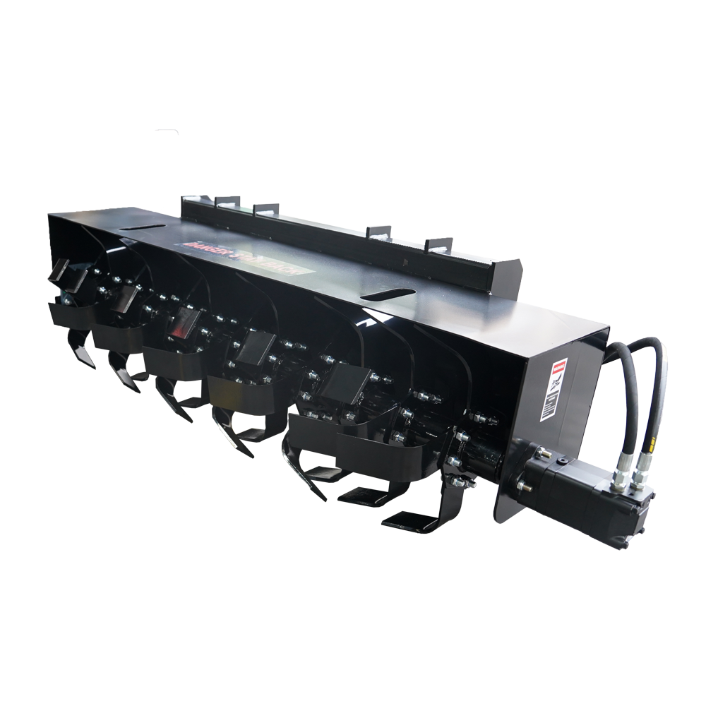 Skid Steer Garden Tiller that will fit most skid steers this is a Light Duty made perfect for those gardens or breaking up the soil or sub soil. This Tiller is a perfect attachment for tilling gardens and small fields. Hunters can make quick work of food plots, and firing lanes. Our Tiller is 72' wide, with 4' cut depth, and bi-directional tiller rotation for different types of soil.