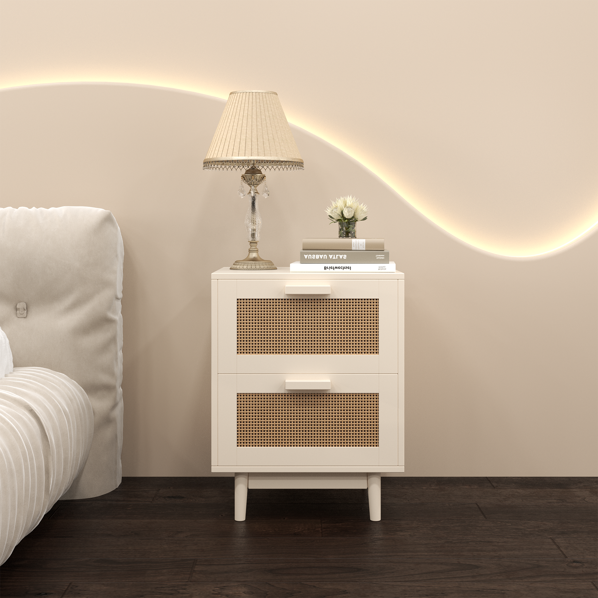- Featuring expertly crafted rattan-style sliding drawers and a natural wood-tone finish, this bedside table combines functionality with aesthetic appeal. Though the rattan is synthetic, it mimics the texture and charm of natural materials, ensuring durability and easy maintenance. This versatile piece functions as a nightstand, bedside cabinet, or storage unit, meeting various bedroom storage needs. With clean lines and a timeless design, it complements a range of interior styles, adding understa