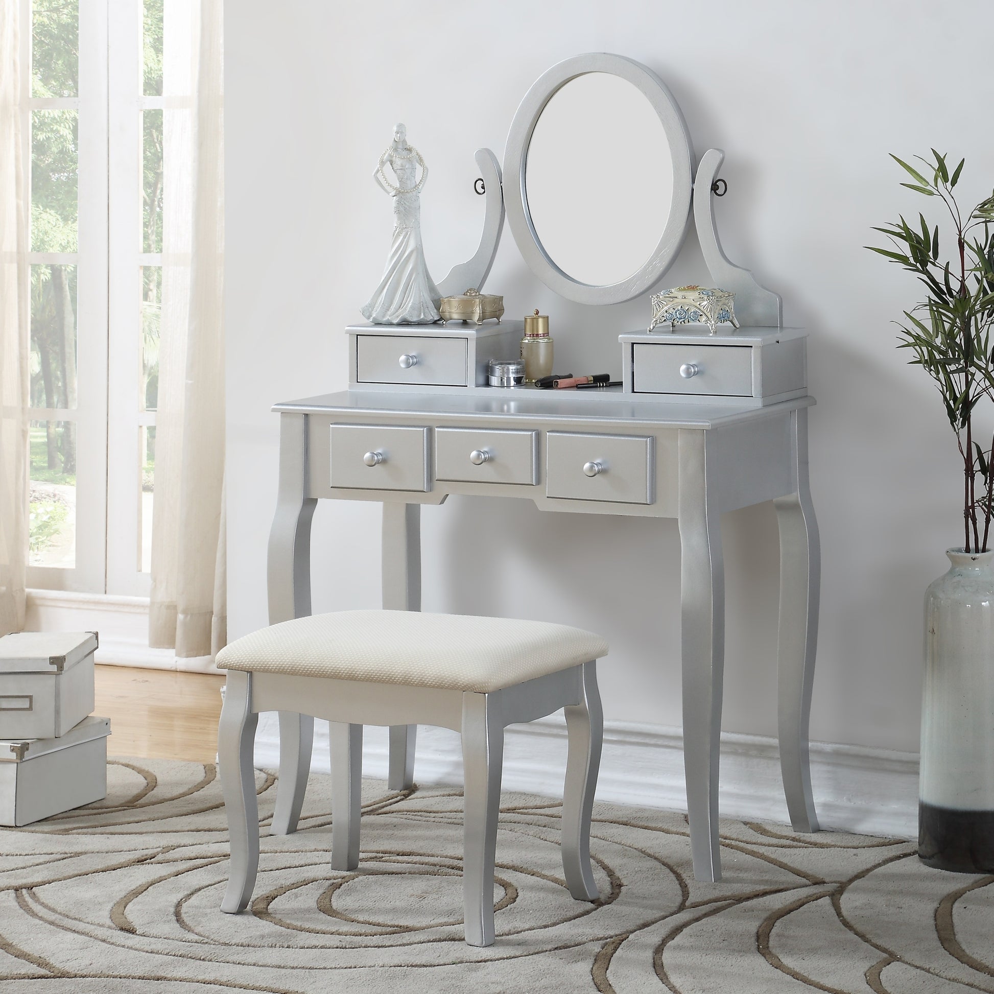 his stylish contemporary vanity table's with swivel adjustable mirrors and 5 storage drawers. Its great for storing all your jewelry and smooth tabletop provides space for cosmetics and beauty supplies. It also includes a matching wooden stool with padded upholstered seat. This is sure to accent your bedroom.