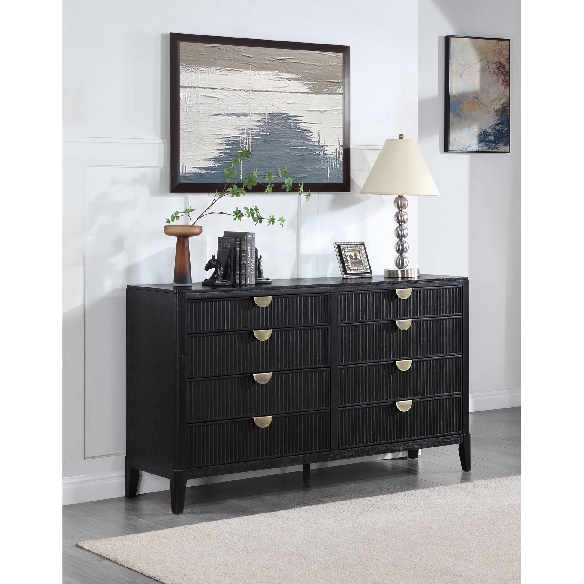 Revamp your bedroom with the understated refinement of a modern eight-drawer dresser. Its black finish and decorative fluted drawer fronts create impeccable elegance, while antique brass-toned demi-lune drawer pulls offer a touch of lightness and gleaming sophistication.
