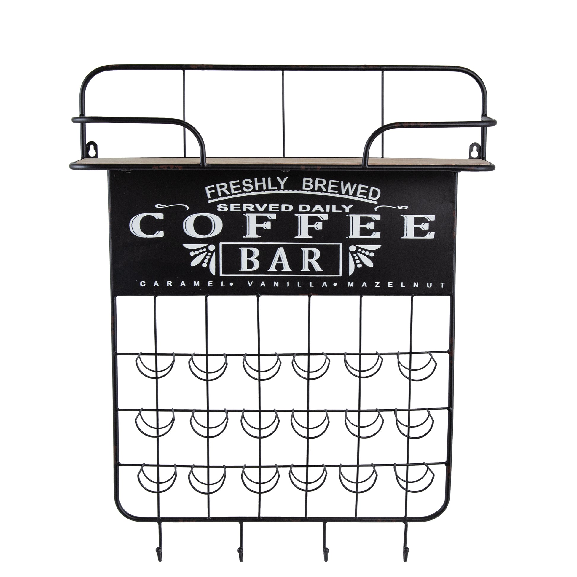 - Featuring 18 slings for your k-cups or coffee pods, four hooks to hold your mugs and cups, a slick black hue, and a spacious shelf for your syrup, sugar, creamer, grinder, and much more, this coffee bar shelf blends style and function perfectly to make your brewing experience as hassle-free as possible.