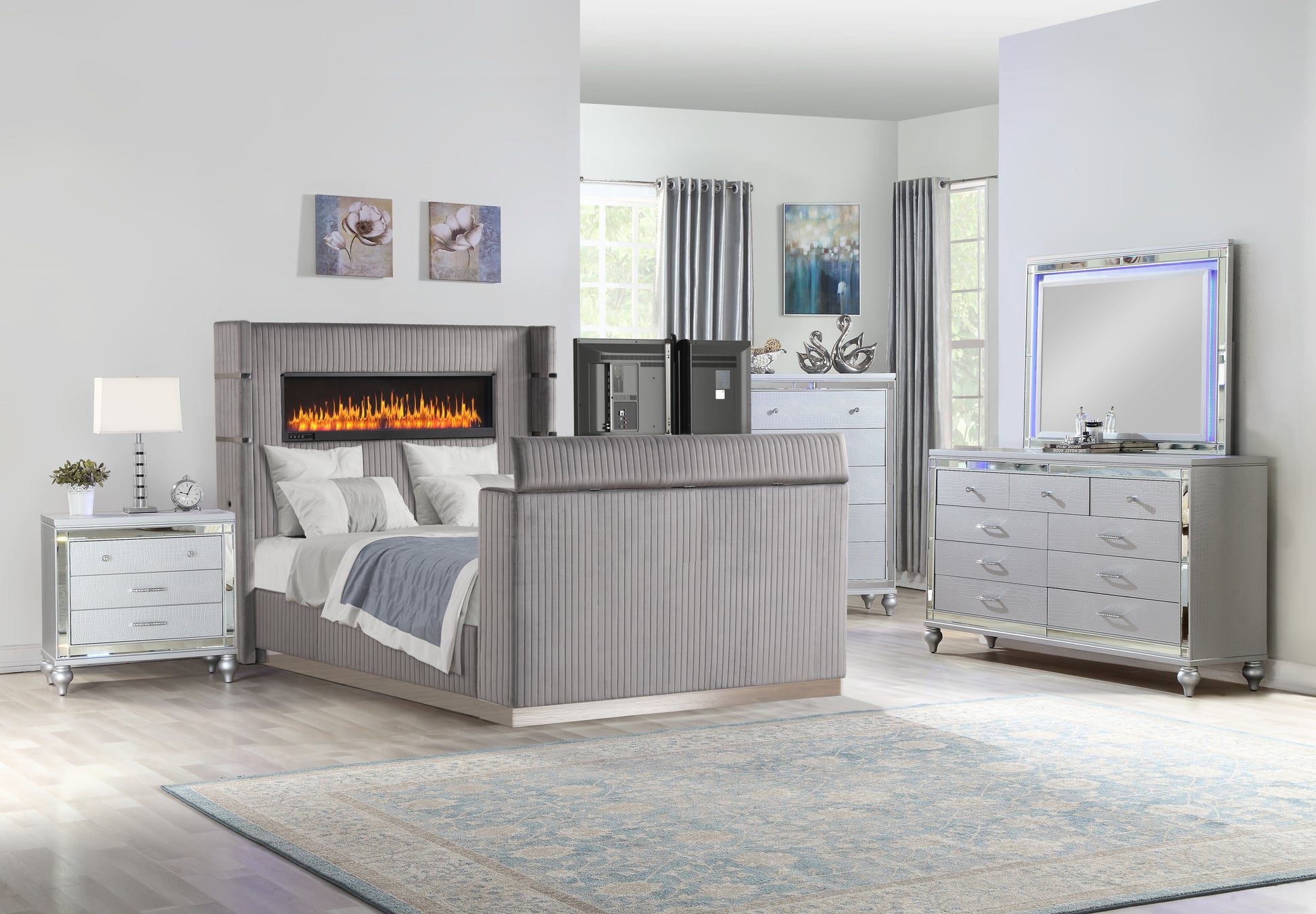 Lavish Modern Style 5 Pc King Bedroom Set Made with Fireplace in Headboard & TV stand in Footboard with Wood in Grey(NJ INVENTORY)