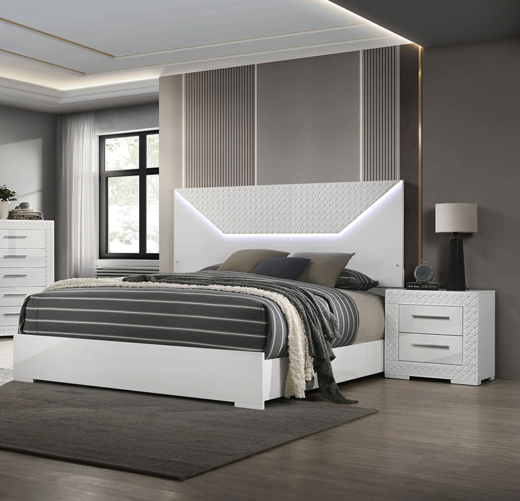 3pc Bedroom Set White High Gloss Finish Queen Size Bed 2x Nightstands LED Headboard Furniture