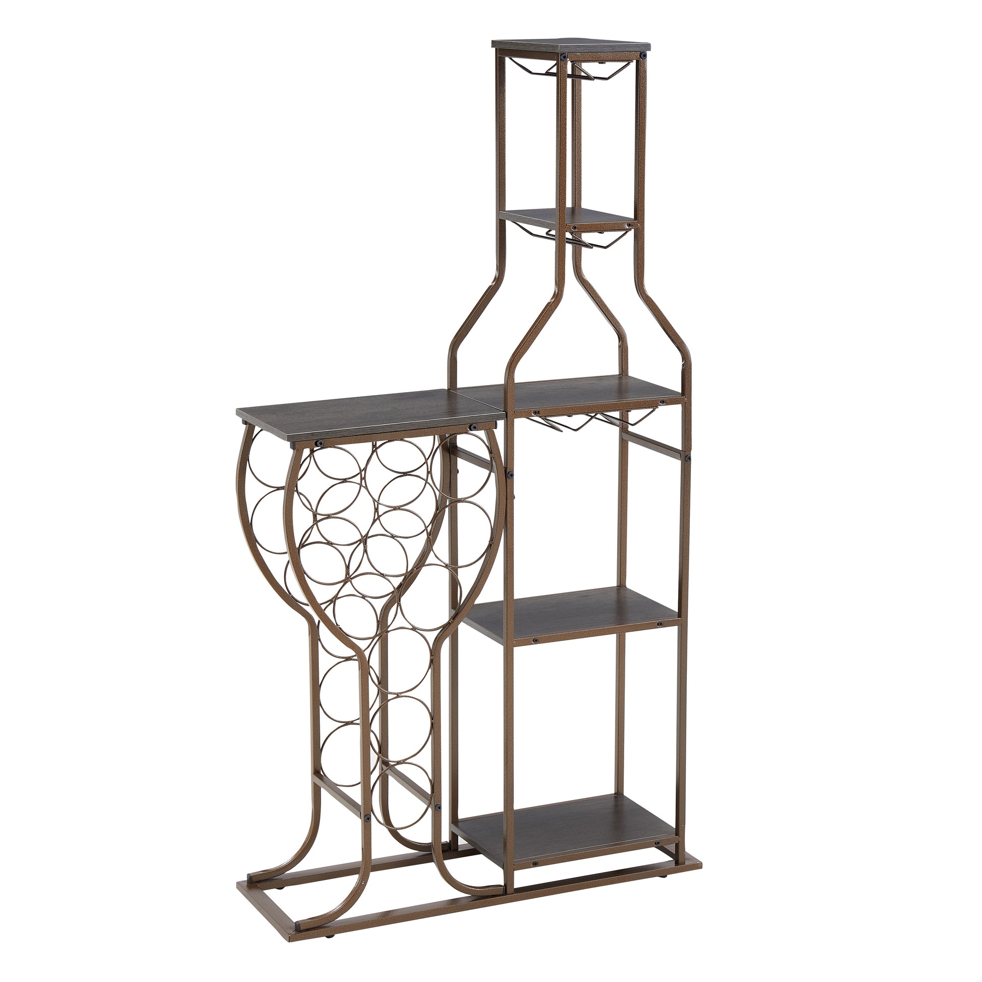 Rustic Grey 11 Bottle Wine Bakers Rack with Hanging Glass Holder and Storage Shelves