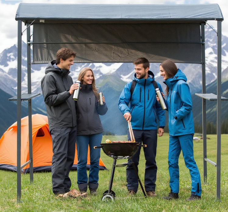 - Weather-Fighting: Polyester top canopy with PA-coating, extra supporting bar, and side awning are UV protective, water-fighting, and fire retardant. This grill shelter provides shade and cover from the sun and rain while still allowing for open flames and cooking functions.