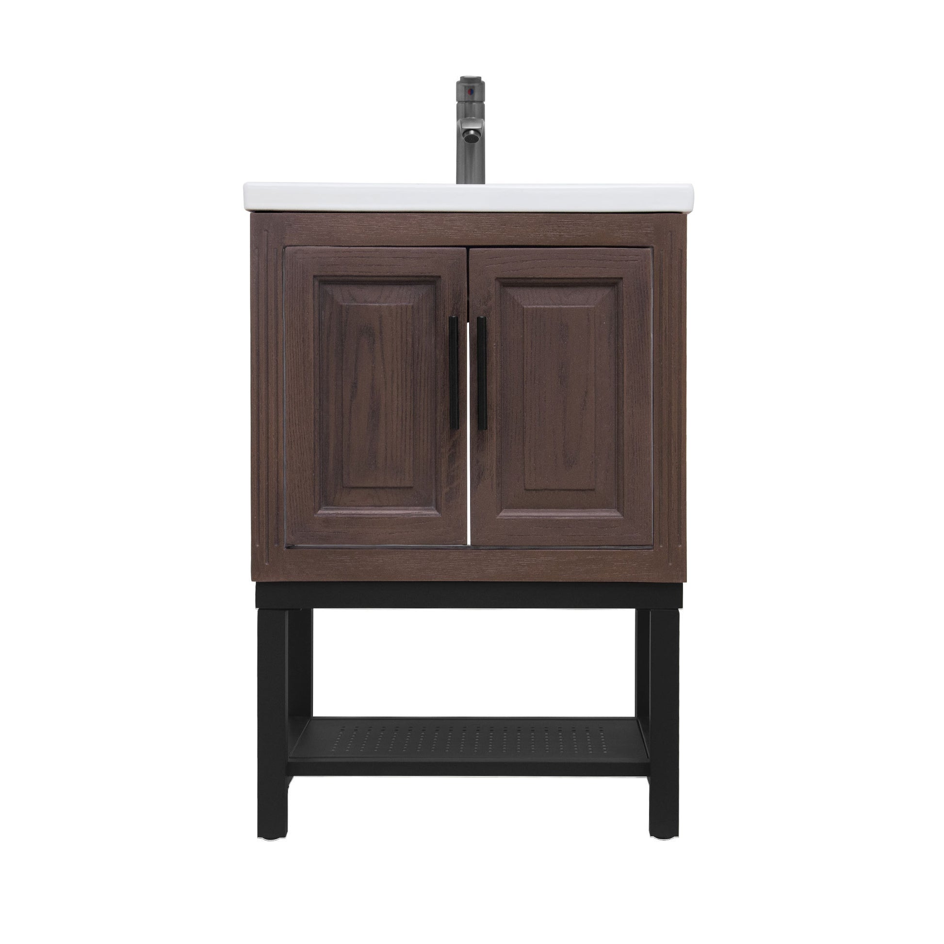 Modern Freestanding 24-Inch Walnut Bathroom Vanity with White Ceramic Sink, Hot and Cold Faucet, 2-Door Cabinet & Open Iron Shelf, Magnesium Oxide and Iron Frame