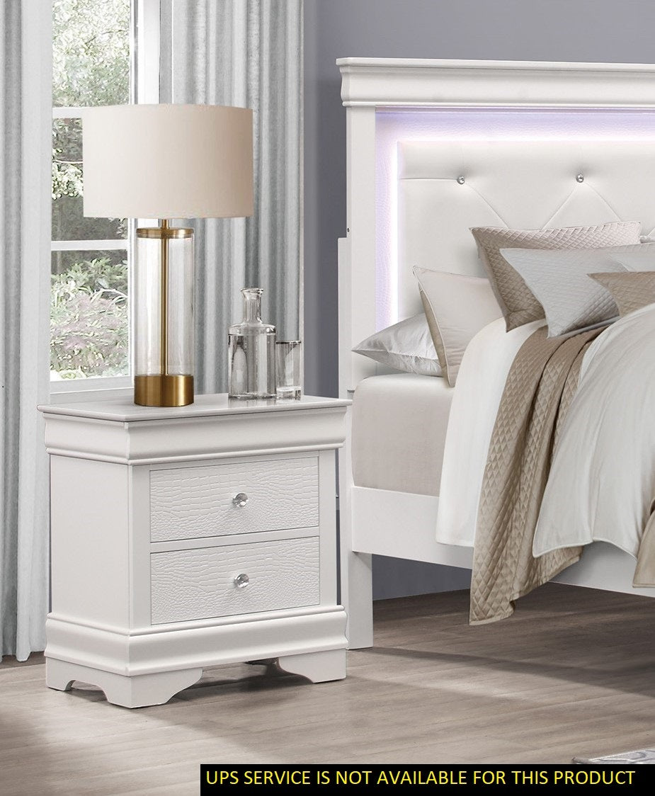 The unexpected intersection of traditional design and glamorous styling creates the dynamic look of the Lana Collection. A white finish is utilized to enhance the faux alligator embossed drawer fronts of the nightstand with crystal faceted knob hardware lending an additional fabulous touch. The nightstand features hidden storage allowing for the discrete placement of your personal affects.