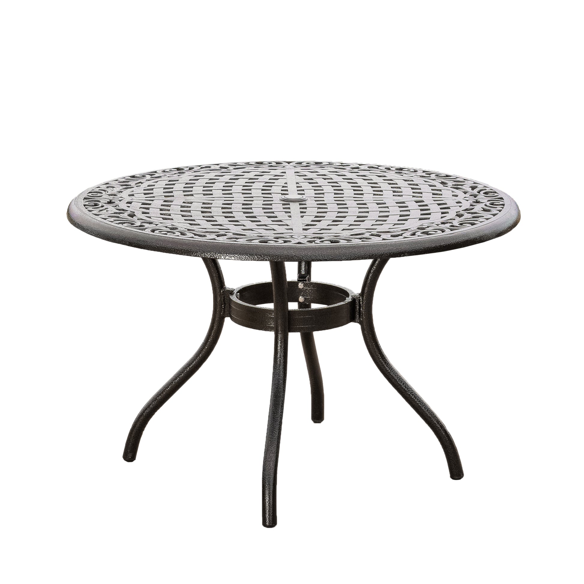 - Made from cast aluminum in a hammered bronze finish, this weather-resistant design features a lattice and scrollwork tabletop a convenient umbrella hole, and gently curved legs.