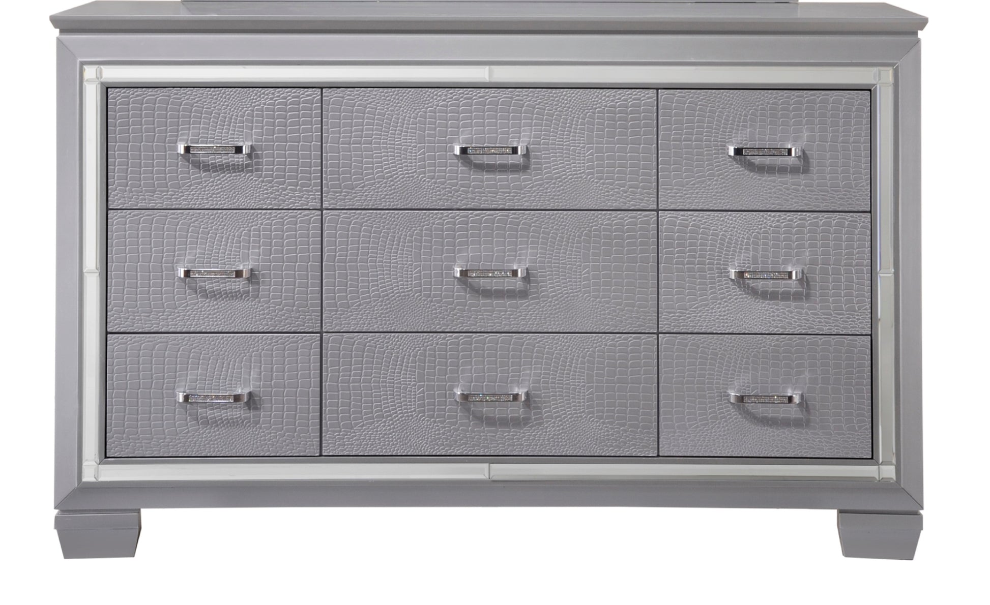 This charming dresser features glittering details such as faux crystal hardware and a bevel mirror accent. Adding to the glamorous design is a silver crocodile skin finish. Not just nice to look at, the dresser has nine drawers sturdily constructed with English dovetail joinery.