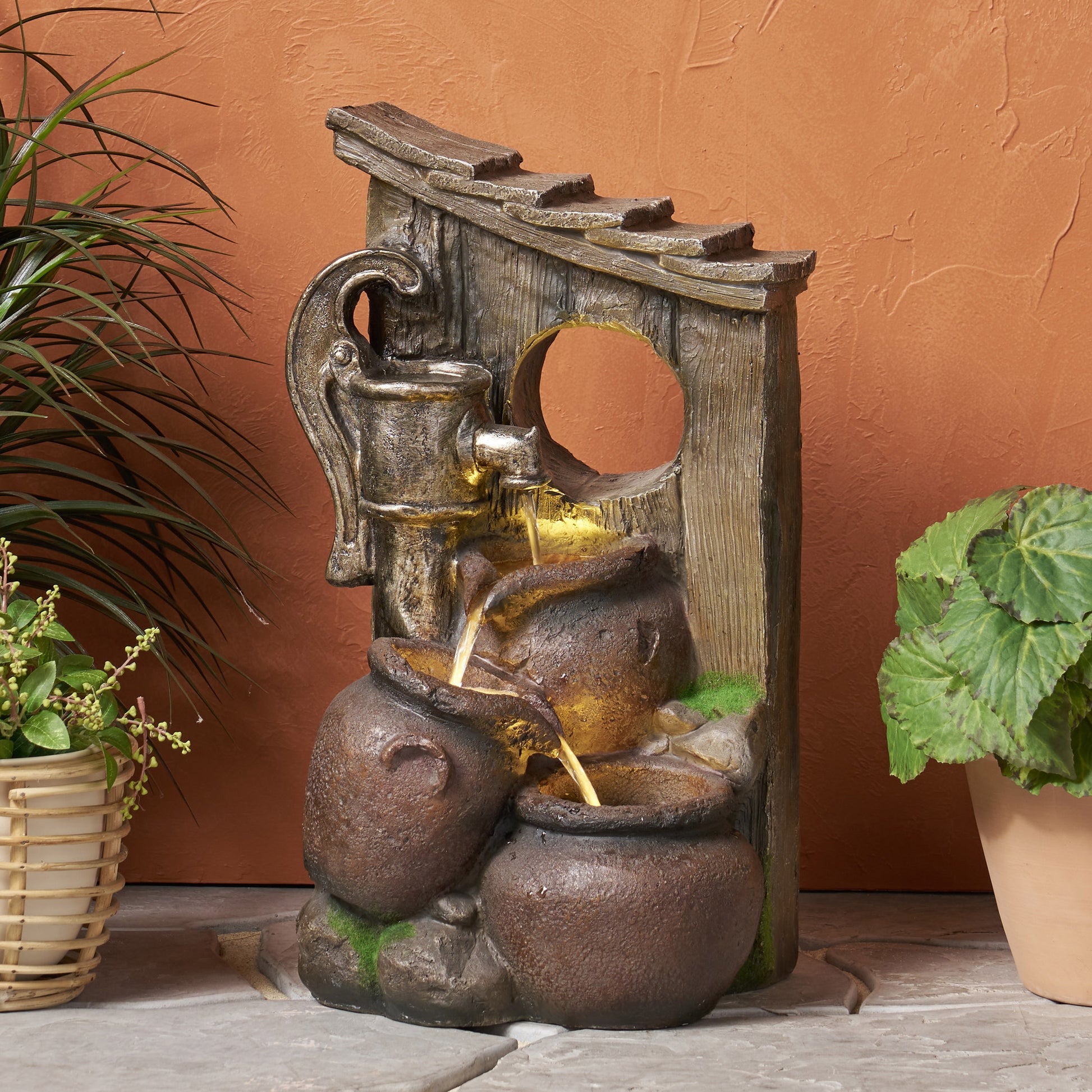 Add a graceful sophistication to your outdoor space with a calming accessory. Our garden fountain features a calm waterfall flow that continuously circulates using an included pump, bringing a playful aura to any backyard or patio. this decorative accessory offers a weather-resistant structure that allows outstanding attention to detail. Finished with a water pump and stacked jar design with enchanting underwater lights, our water fountain is sure to add a touch of whimsy to your home.