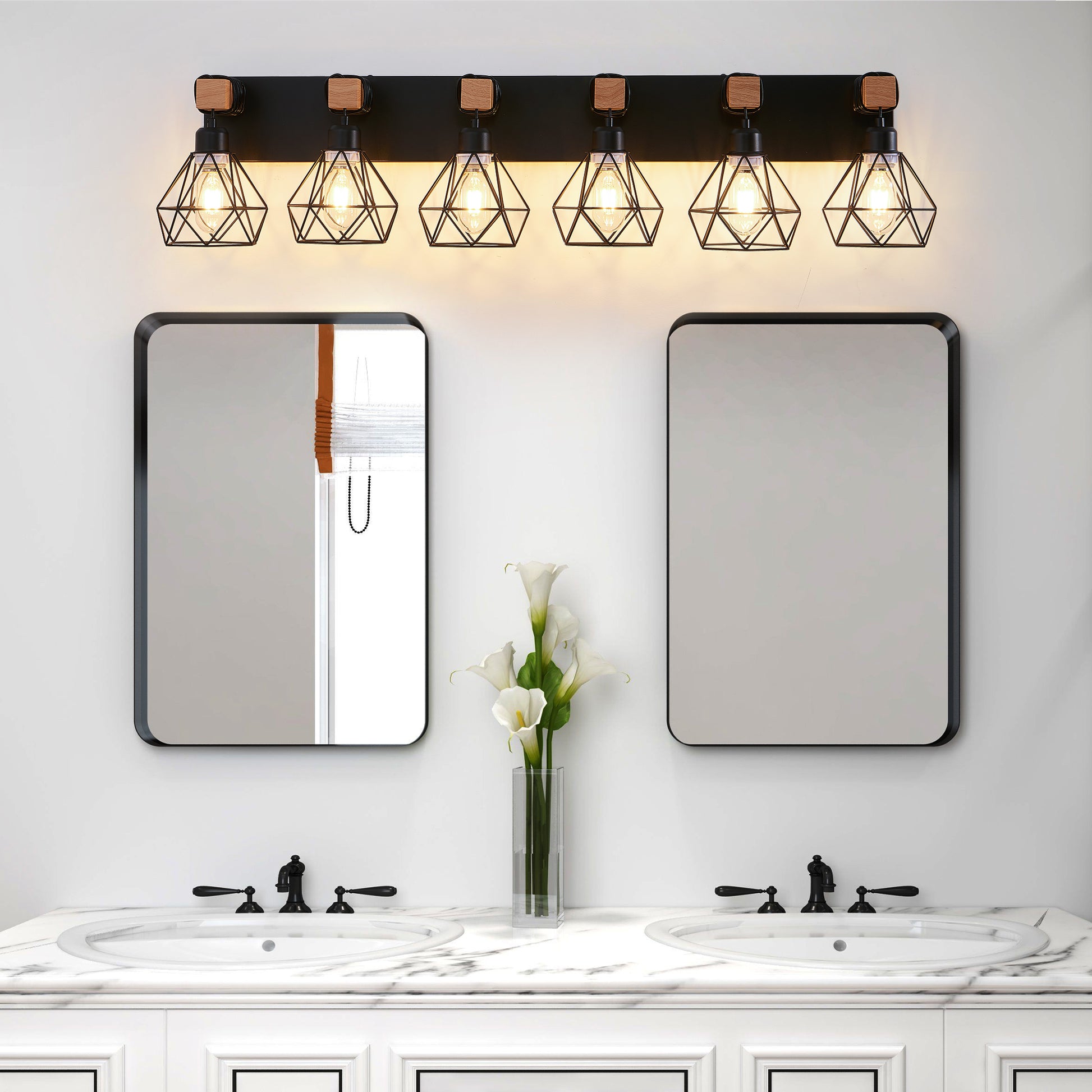 38' Modern Geometric 6-Light Vanity Light Fixture with Black Metal, Wooden Accents and Cage Lampshade for Bathroom, Bedroom, or Living Room (Bulb Not Included)