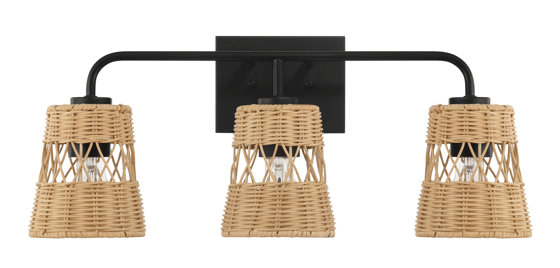 - Transform your bathroom into a serene and stylish sanctuary with the Moonlit Three Lights Wall Sconce. Elevate your experience and indulge in the perfect blend of functionality and beauty. The black metal finish perfectly complements the farmhouse style, while the rattan shade adds a touch of nature.