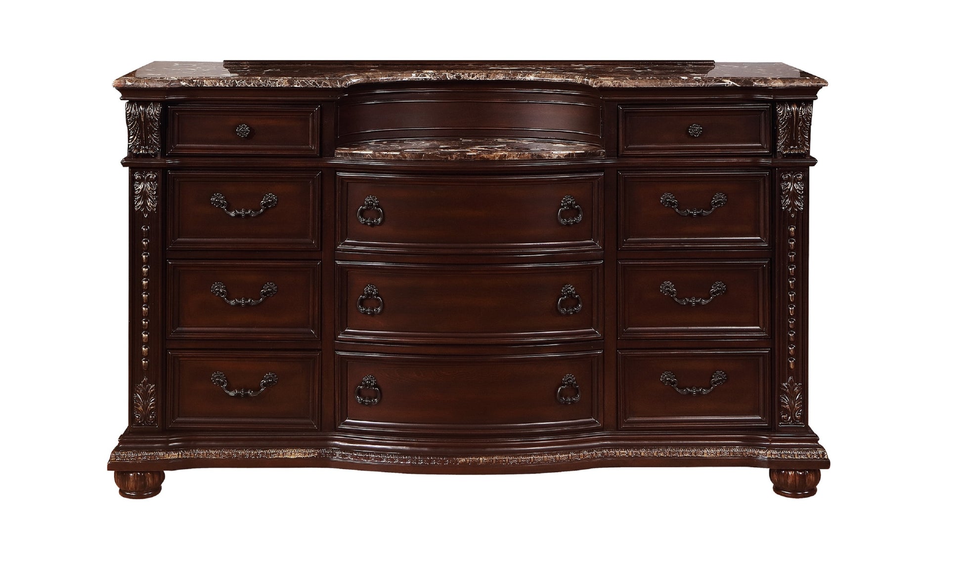 1pc Marble Top 11 Drawers Dresser Intricate Moldings Beautifully Curved Silhouette Brown Dark Cherry Finish Bedroom Solid Wood Furniture