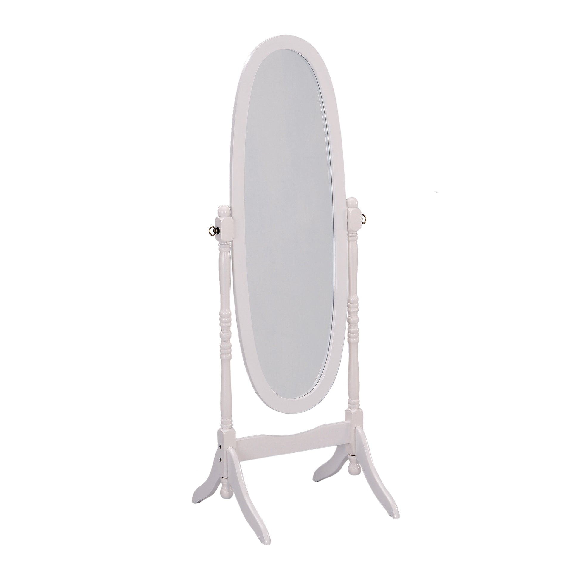 - adjustable full-length free-standing cheval mirror stand has an Oval frame finished in a soft white tone, sleek lines, and a swivel feature to move the mirror around as you wish.