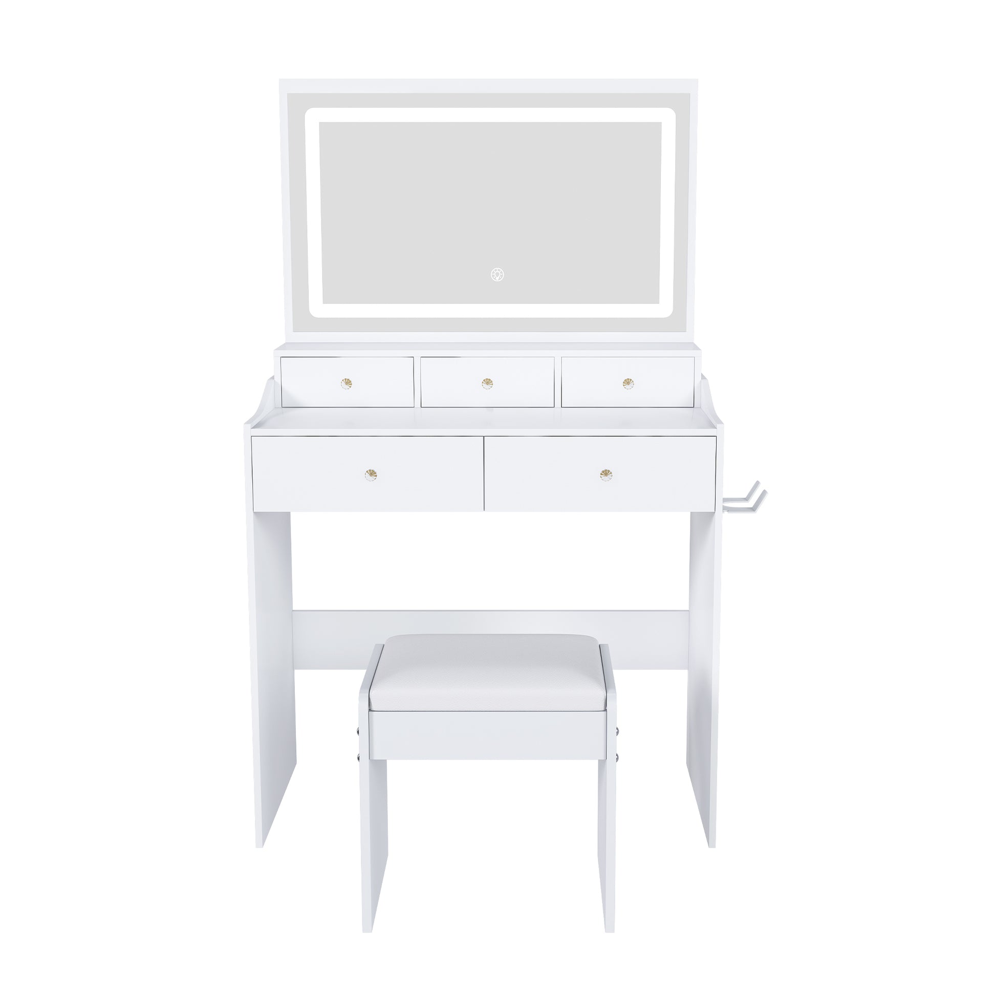 Modern White Vanity Desk with Large Mirror, Power Outlet & Hair Dryer Holder, Adjustable Lighting, 5 Drawers