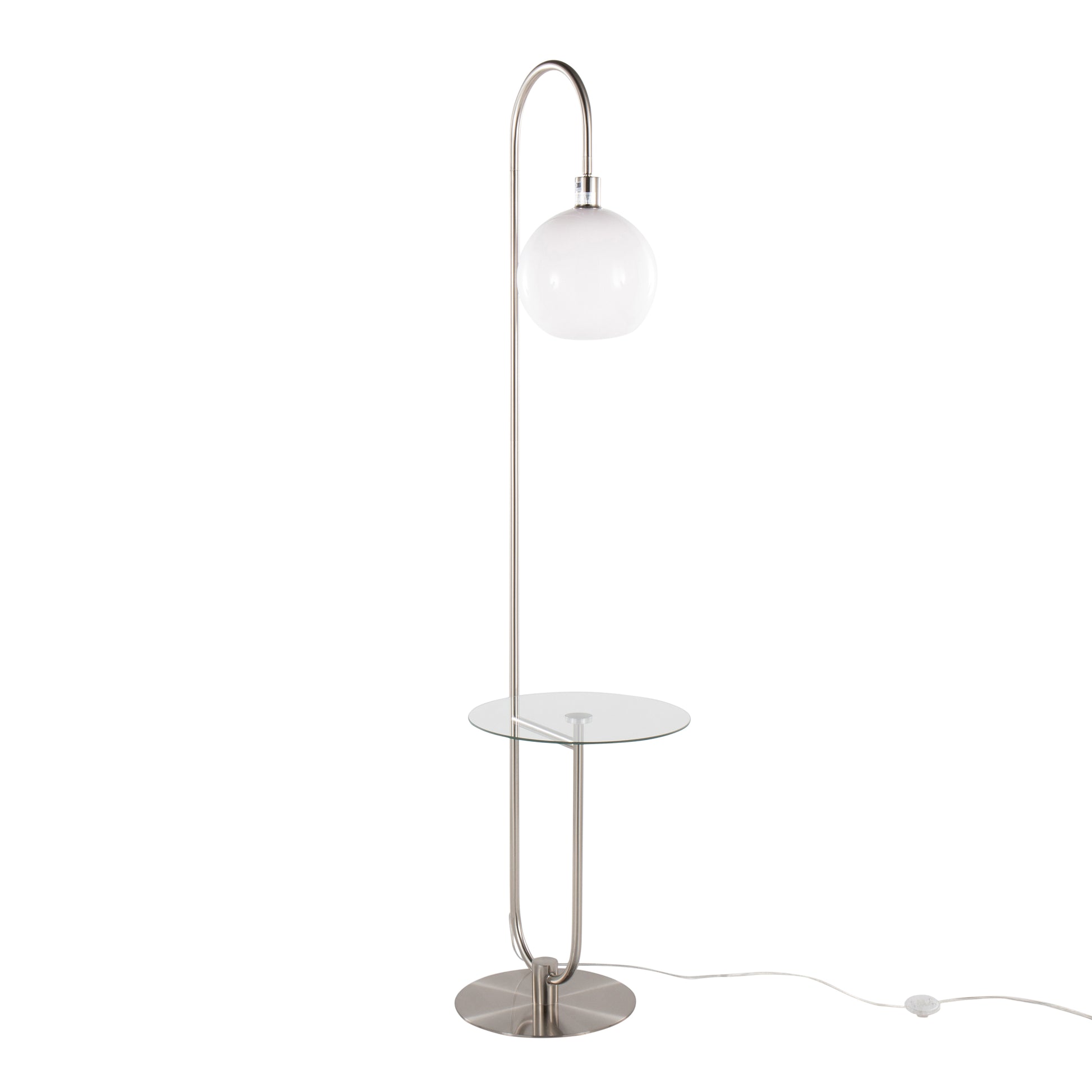- A chic mix of materials creates a contemporary look that will fit any room. The Trombone Floor Lamp by Lumisource is the perfect size for smaller spaces. With a nickel frame, attached tempered glass table, and white round sconce, the Trombone will look great next to any sofa, accent chair, or even in a bedroom.