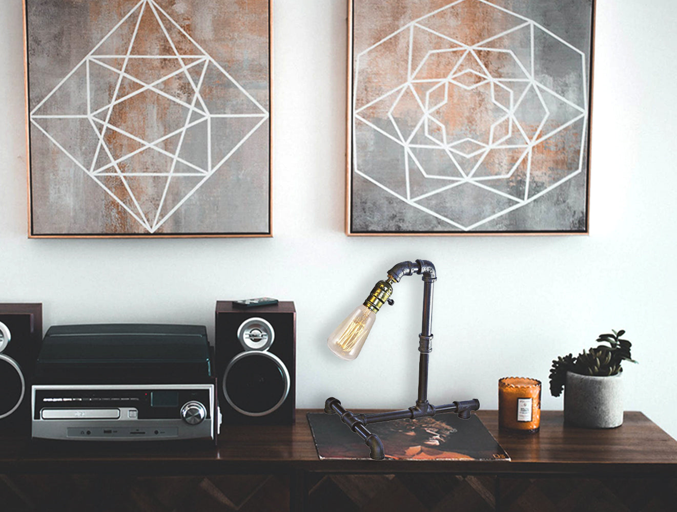 - Matte black metal finish with visible fittings for a rugged, mechanical look