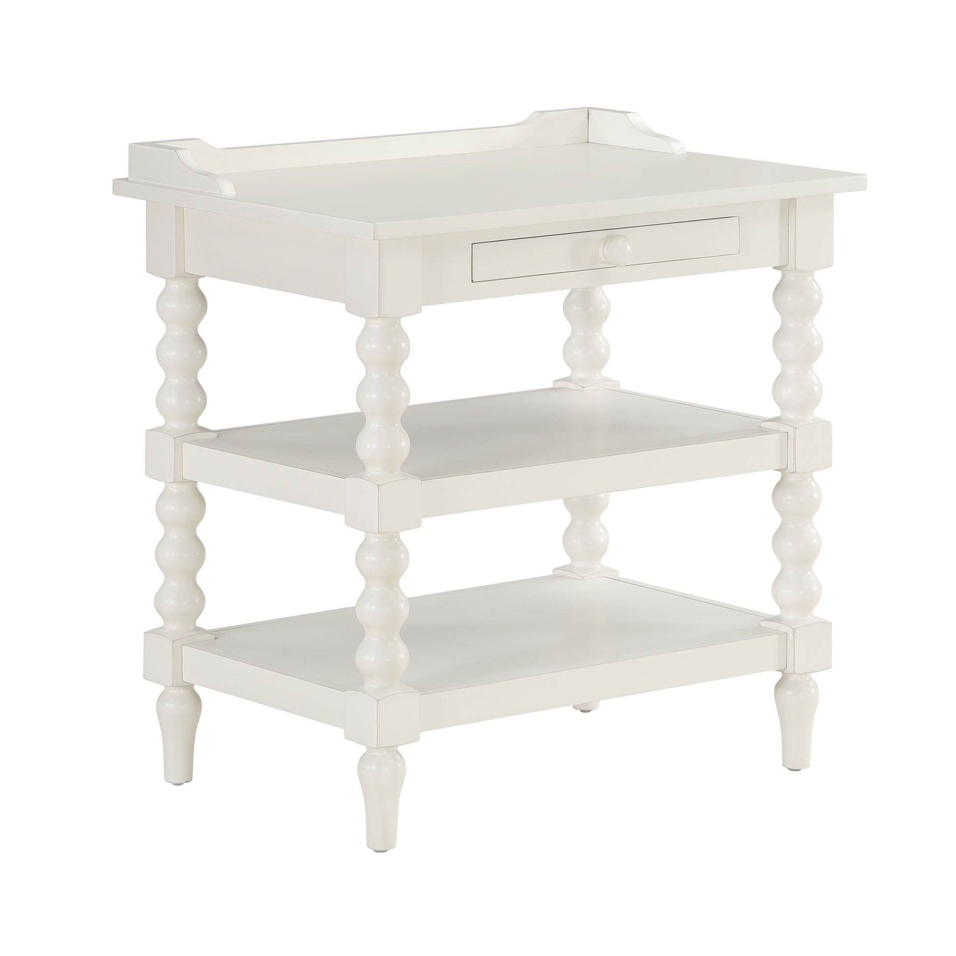 Aria Antique White Nightstand with Vintage Styling, Wood Construction, Two Shelves, Pull-Out Tray, Spool Turned Legs, 26.00 x 18.00 x 26.75 Inches