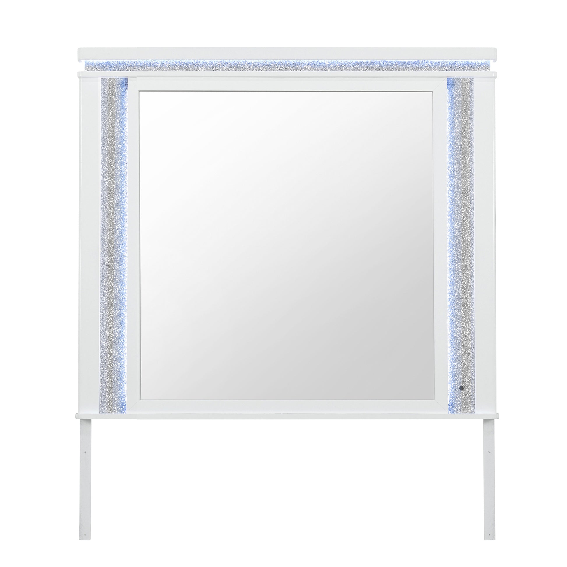 Adalid Square Shaped White Mirror with LED Lighting and Glittered Detailing in Solid Wood and MDF
