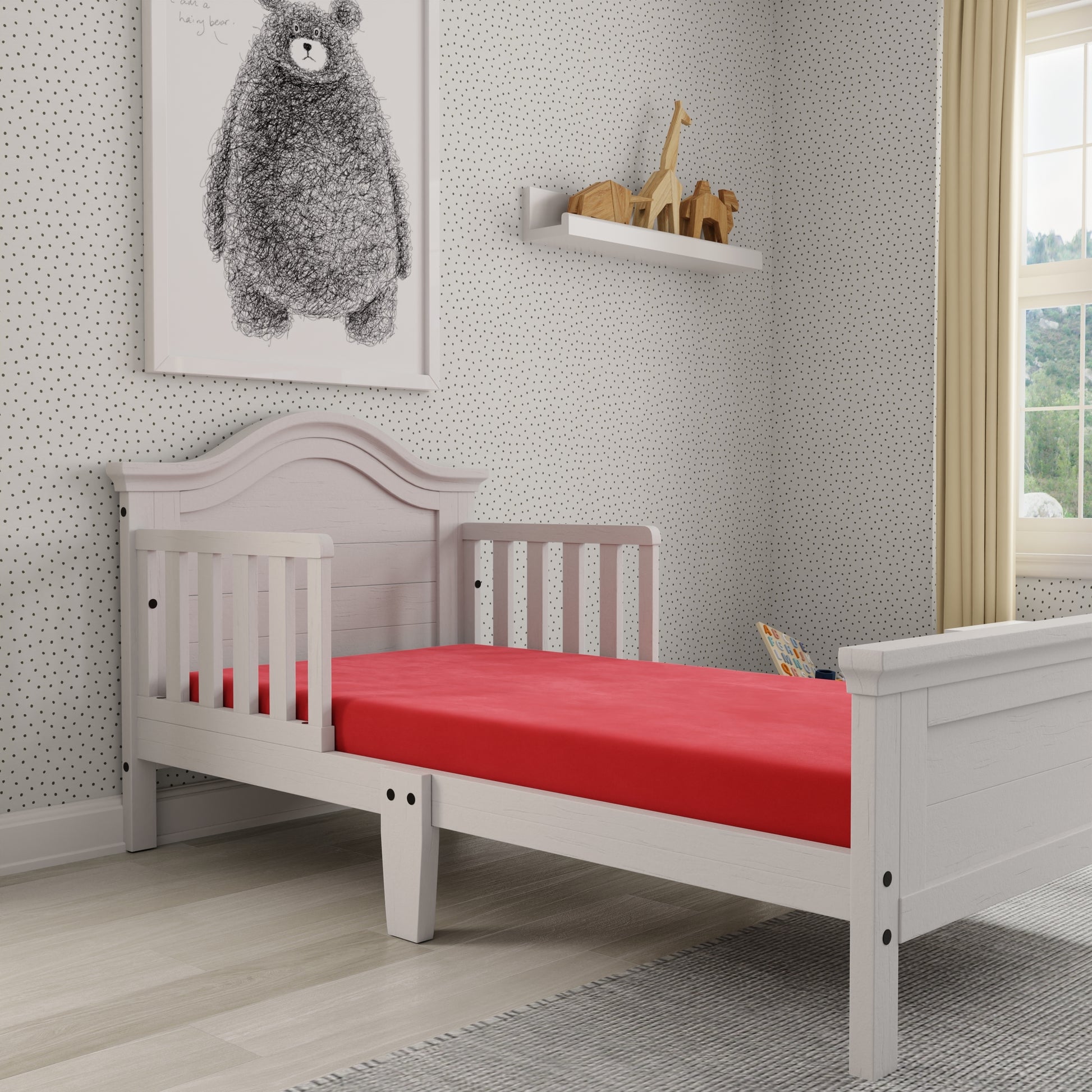 - This mattress is thoughtfully designed to provide children with a comfortable sleep environment. Its vibrant red cover is water-resistant, offering protection against spills and accidents while ensuring easy maintenance. The mattress features a memory foam comfort layer and high-density support base, delivering long-lasting support and durability. This combination ensures a balanced sleep surface that caters to the needs of growing children.
