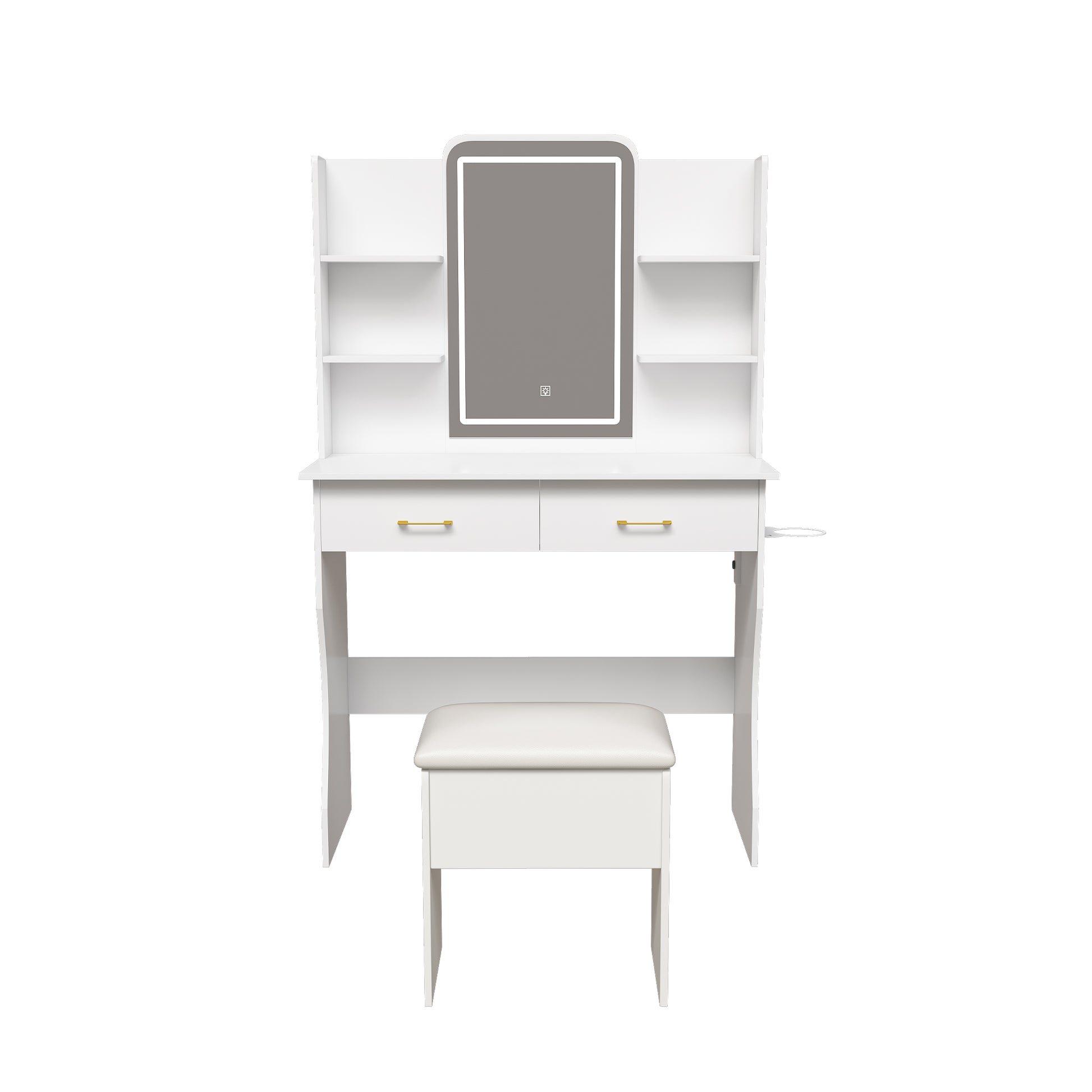 Vanity Desk with LED Lights Mirror, Power Outlet, Storage Drawers & Chair, White MDF, 35.43 x 15.75 x 53.94 inches