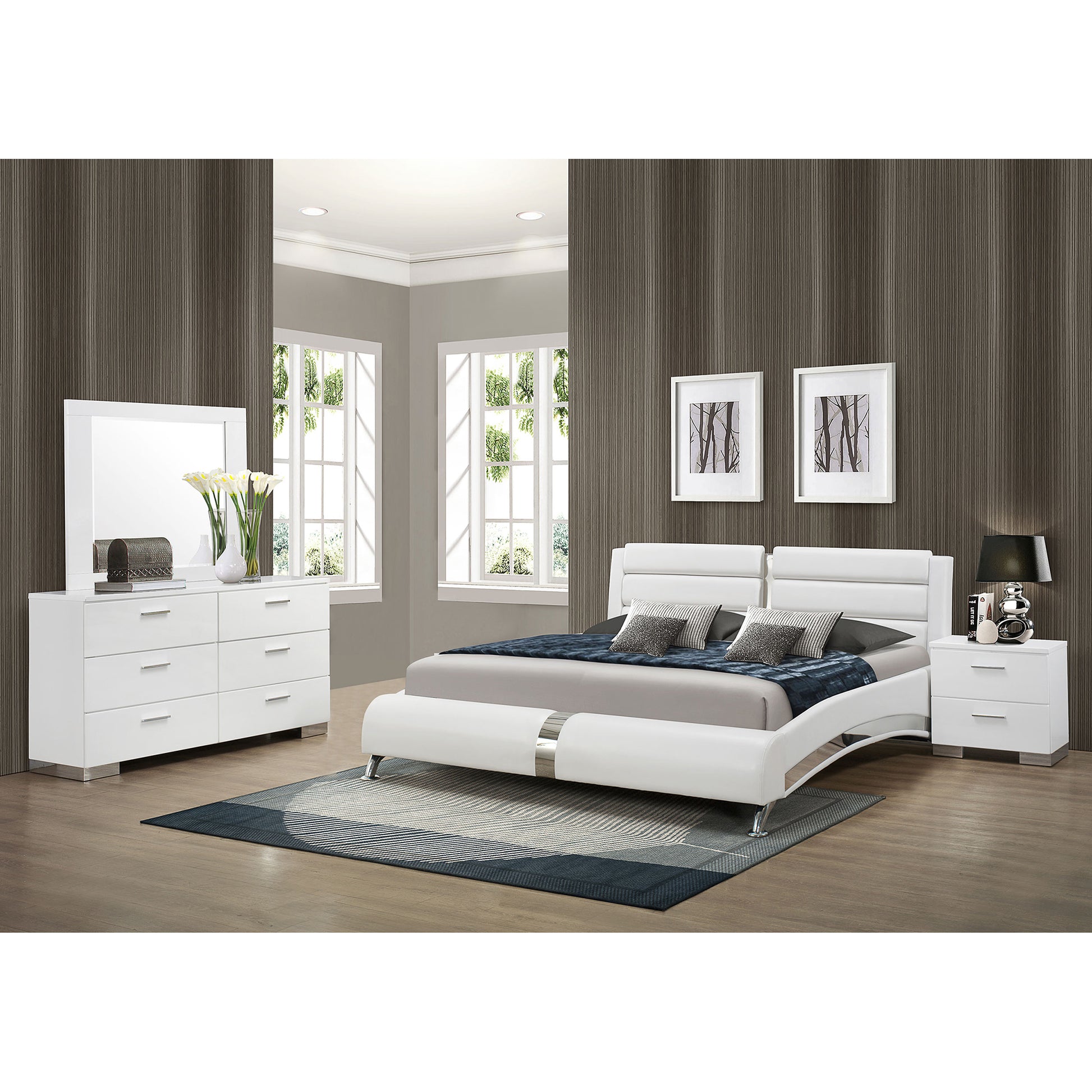 - Four-piece bedroom set features a sleek, contemporary design with a white polyurethane coating polished to a glossy finish