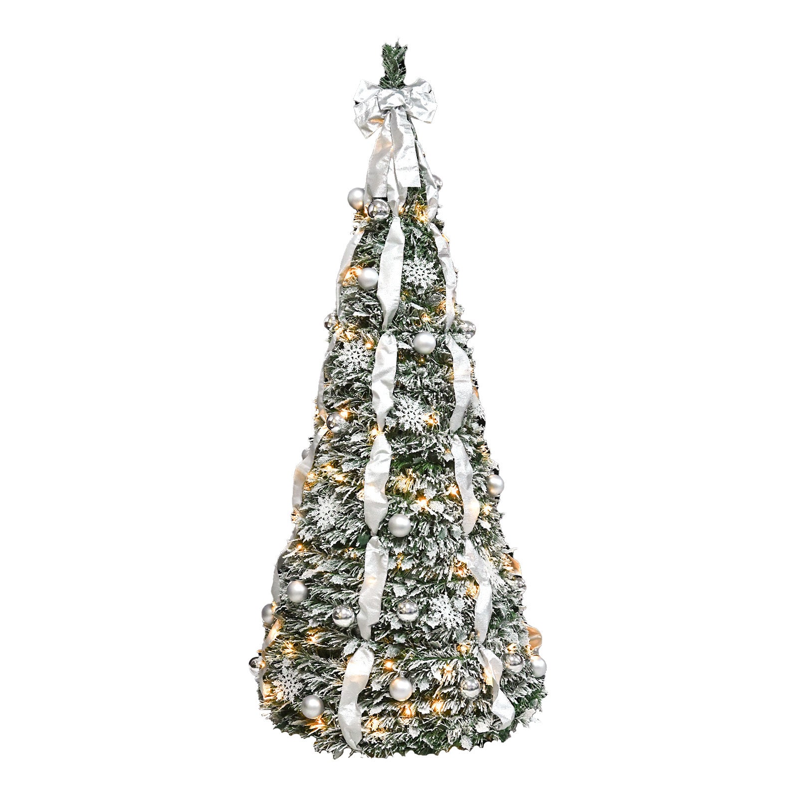 - Pre-Decorated with Ornaments and Classic Holiday Accents - Comes fully adorned with 18 matte ornaments, 18 silver ornaments, 18 snowflakes, 6 festive ribbons, and a large bow—everything you need for a beautifully styled tree.