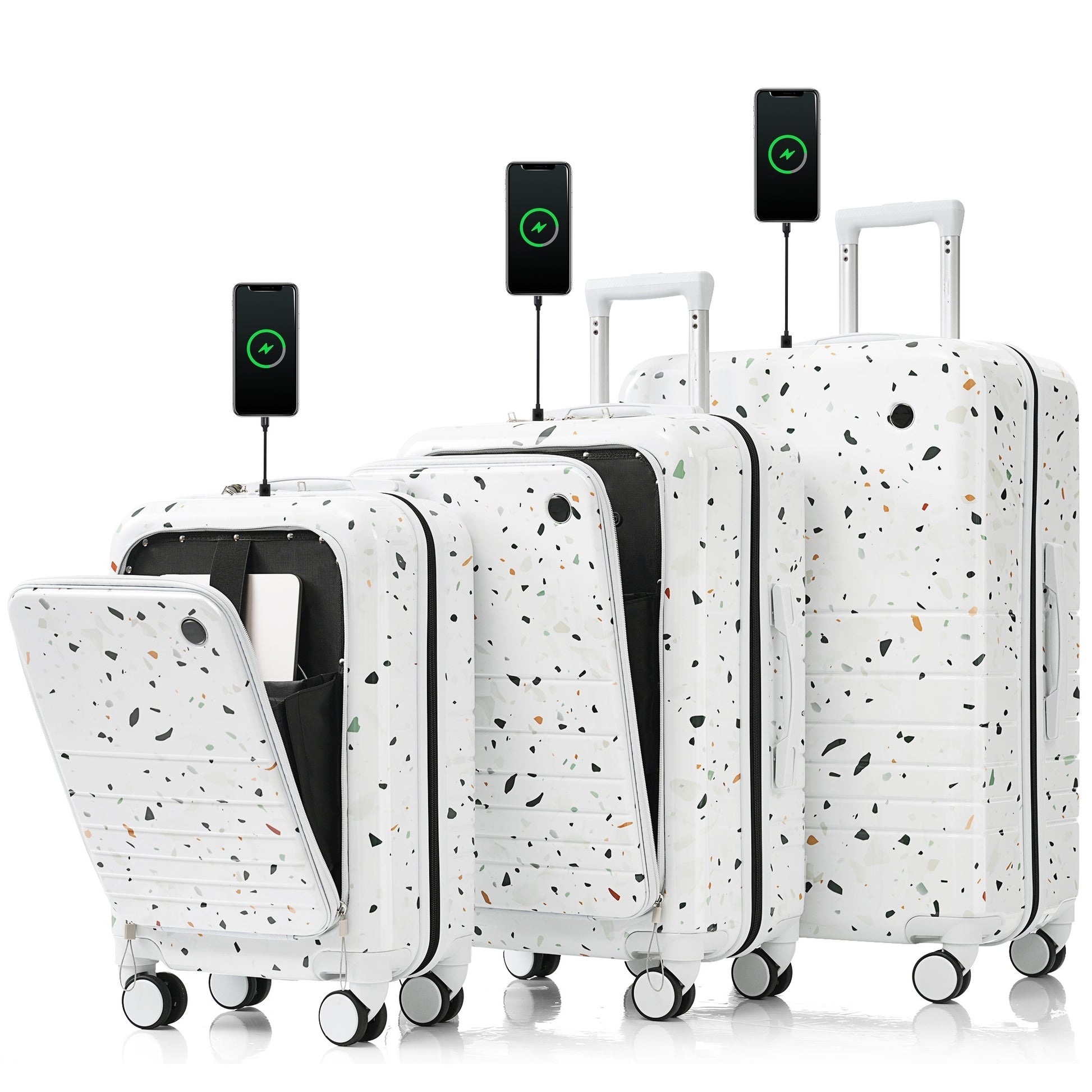 Luggage Set of 3, 20, 24, 28inch with USB Port, 20, 24inch with front opening design Airline Certified Carry on Luggage with Cup Holder, ABS+PC Hard Shell Luggage with Spinner Wheels, starry sky white