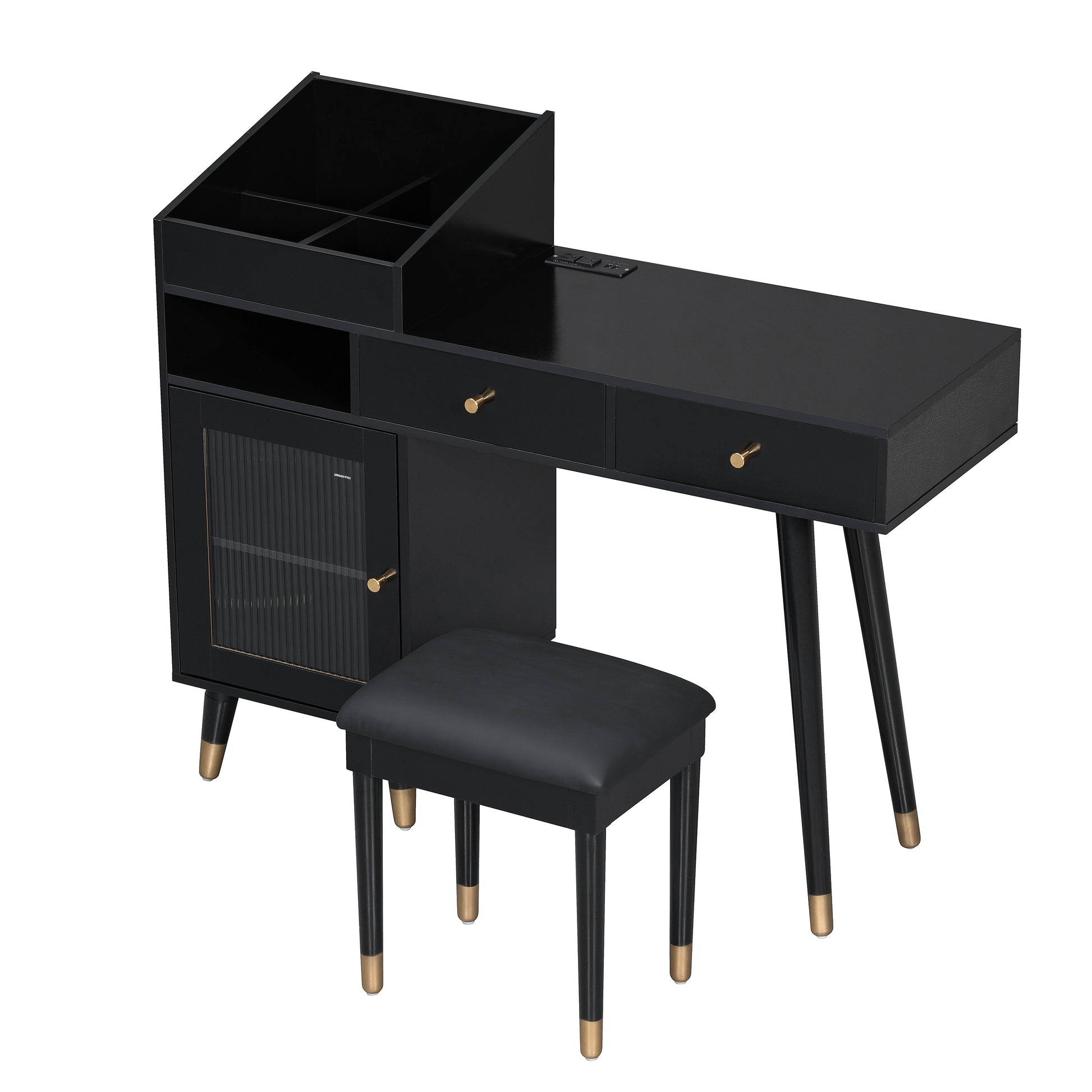 Modern Makeup Vanity Desk with Drawers, Cabinet & Charging Port, Black Engineered Wood, Space-saving Design for Small Places