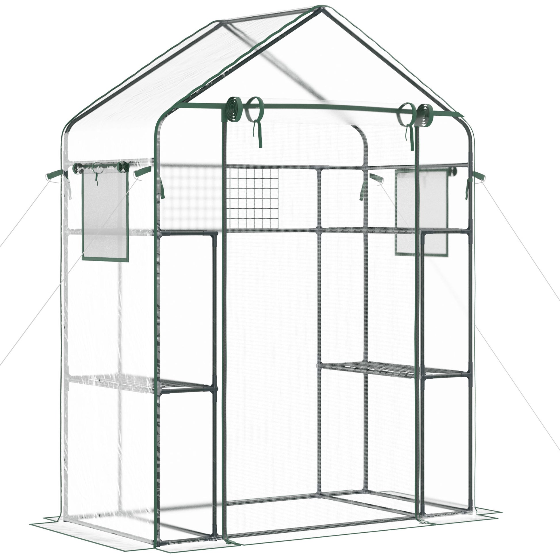 Outsunny Outdoor Walk-in Mini Greenhouse with Mesh Door & Windows, Small Portable Garden Green House with 3 Tiers 6 Shelves, Trellis, & Plant Labels